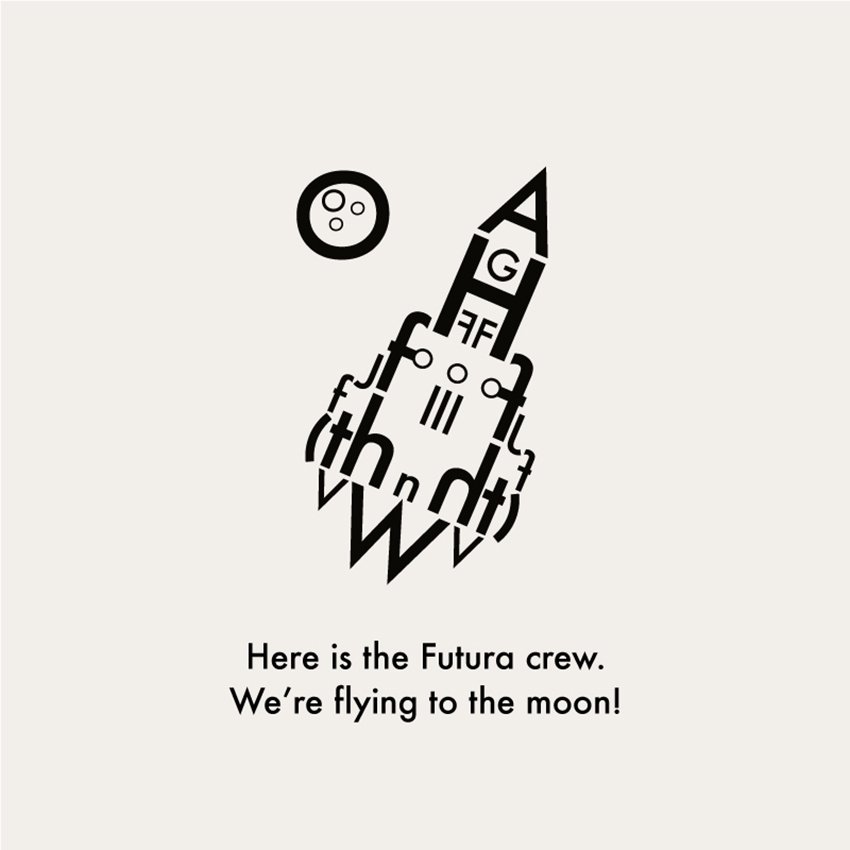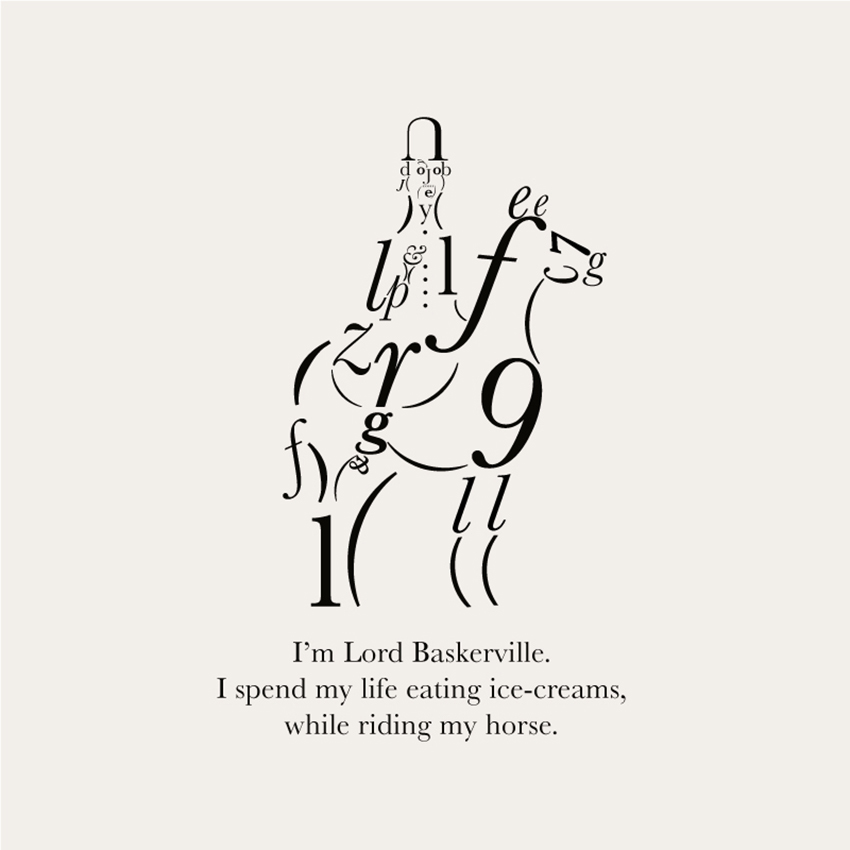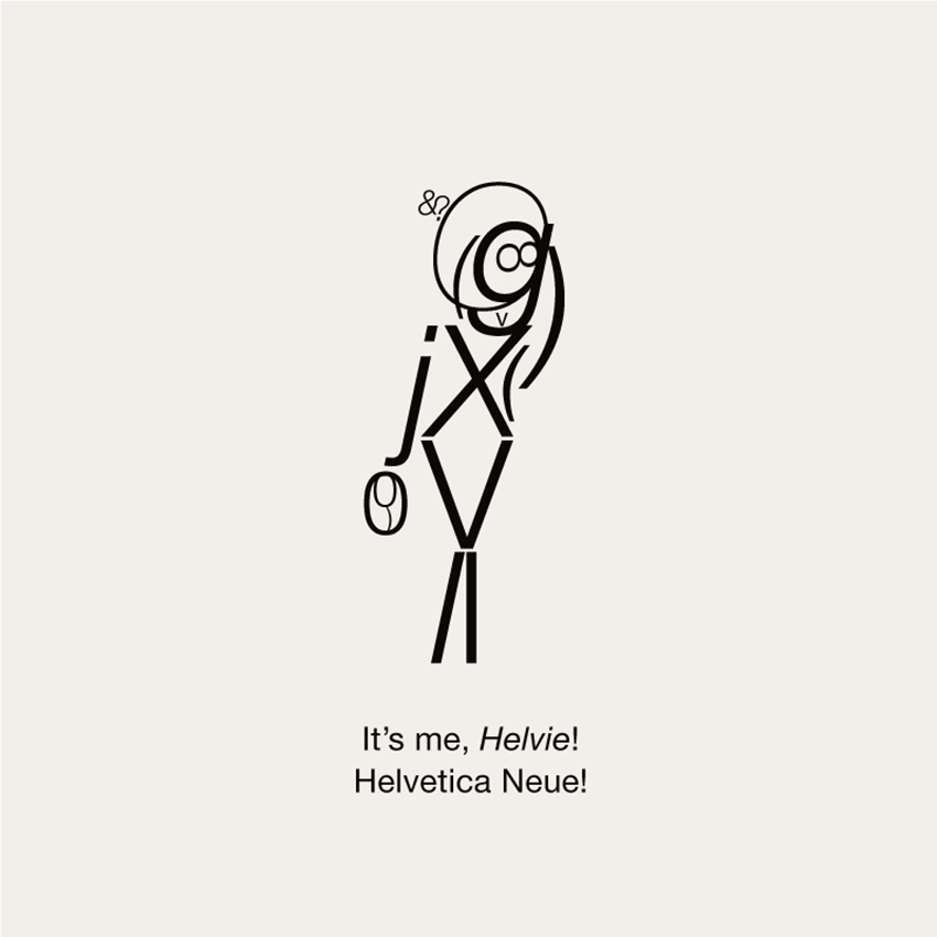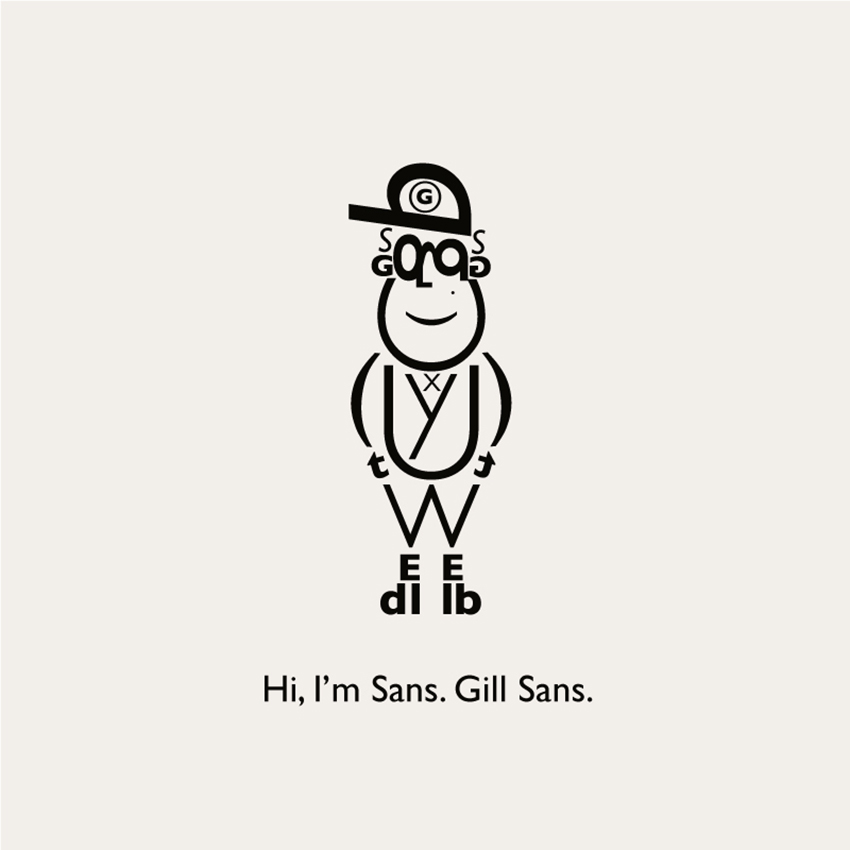 “Il Gill Sans, simbolo di eleganza e innovazione britannica del ‘900, è diventato un ragazzotto col trucker cap. Tutto è nato dalla famosa g minuscola usata come un paio di occhiali (“A pair of spectacles”, Eric Gill), che mi suggerivano un nerd brufoloso. L’Helvetica ha una storia tipografica di rigore e compostezza ma nel tentativo di farne una figura umana ne è uscita una donna vestita a festa che parla al telefono. Il Baskerville e il Futura sembrano avere un’identità più coerente. Il primo per il misto di eleganza ed esuberanza da nobile britannico, il secondo per essere stato il simbolo di una modernità che pretendeva un mondo geometrico e iper-progettato, ma soprattutto per essere stato il primo carattere tipografico ad essere andato sulla Luna, nel 1969″.