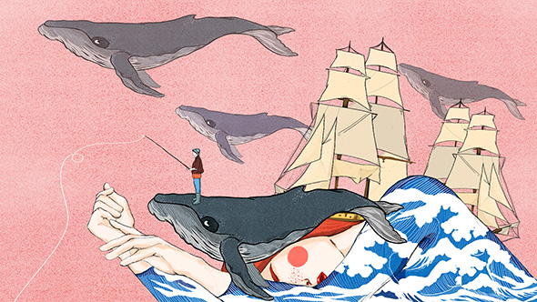 “Mentre disegnavo immaginavo di essere stesa sulla spiaggia, ancora bagnata, il sale che sfrigola sulla pelle, gli occhi chiusi. Gli unici rumori sono le voci dei pescatori, lo sfregare delle vele di una barca, il suono ovattato del mare. In quello stato puoi immaginarti tutto quello che vuoi, anche un cielo rosa e delle balene che ci nuotano dentro”.