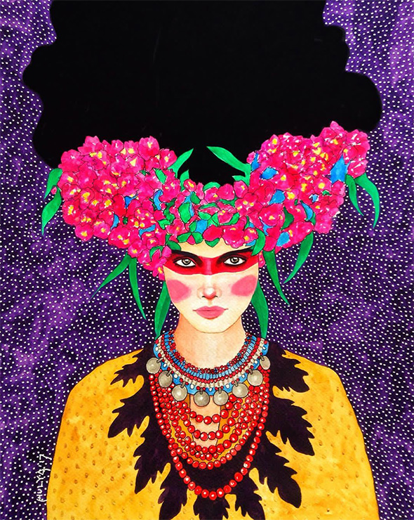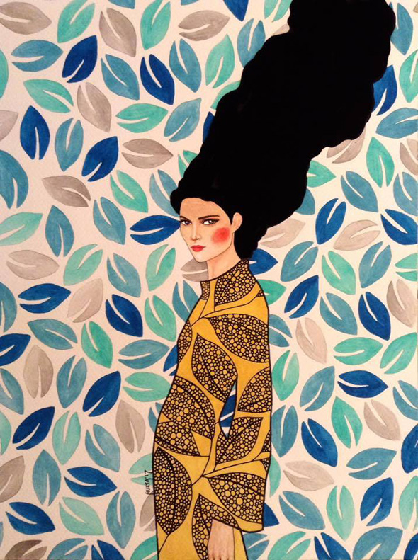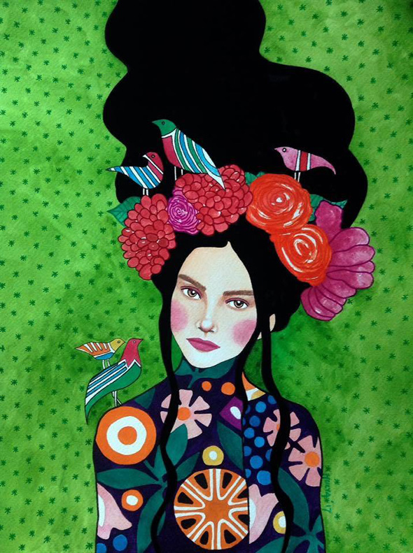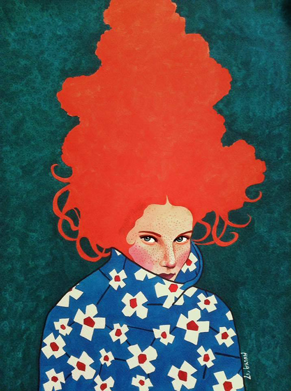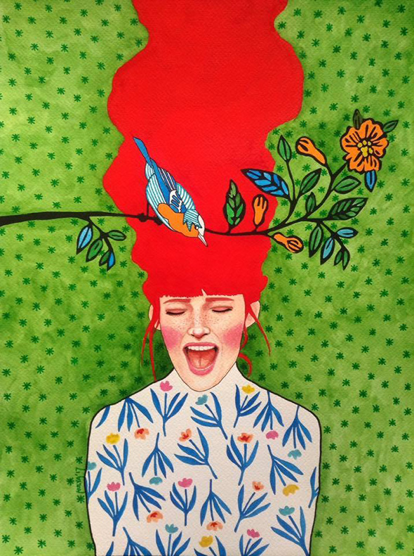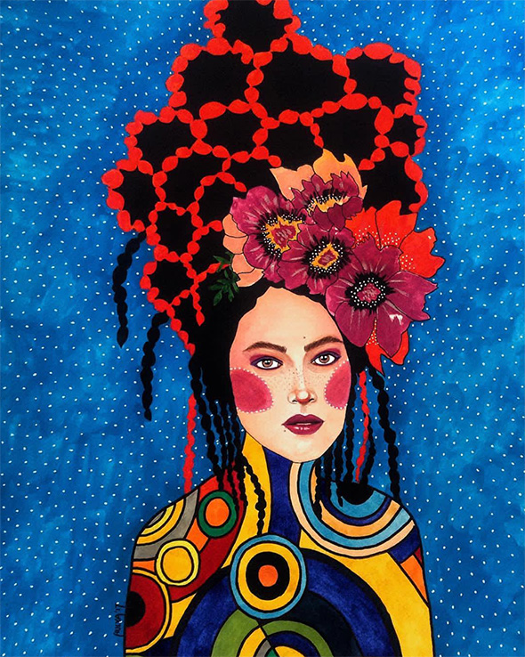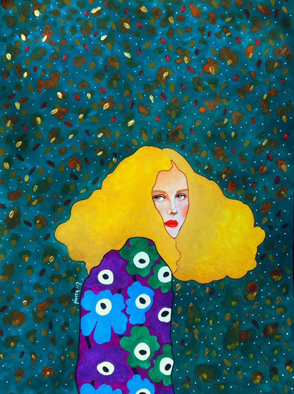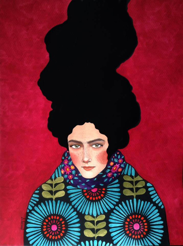 I suoi ritratti sembrano galleggiare in uno spazio tutto loro, tra arte e illustrazione. Le protagoniste sono donne dallo sguardo penetrante e diretto, che quasi sfidano lo spettatore con la loro femminilità forte e vissuta. Alcune vestono un’armatura su uno sfondo rosso sangue e sembrano pronte alla battaglia, altre portano i capelli come una nuvola nera di pensieri pesanti, altre ancora cantano da sole, ma sempre in comunione con la natura astratta che le circonda. Fiori, piante, animali, si dispongono in totale accordo con quanto sembra avere nella mente e nel cuore la loro musa: a volte imperscrutabilmente minimalisti, a volte brillanti e Art Nouveau, altre volte intensi come paesaggi impressionisti di primo Novecento.