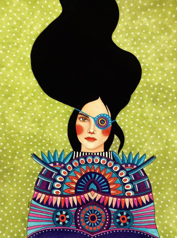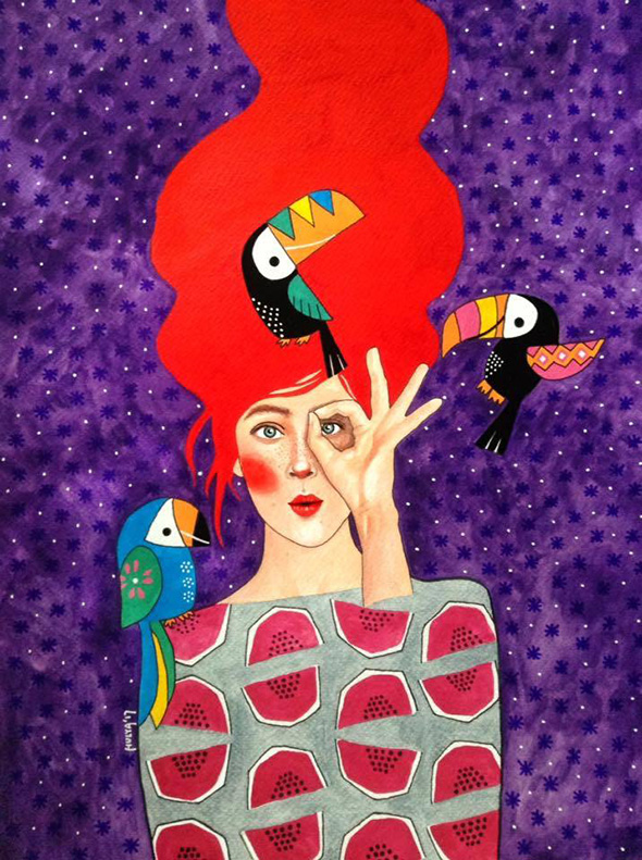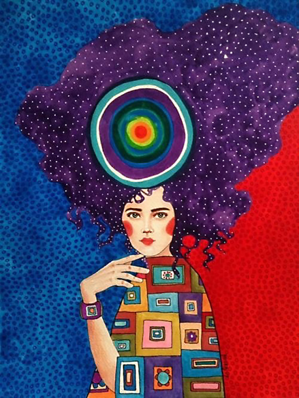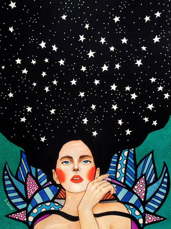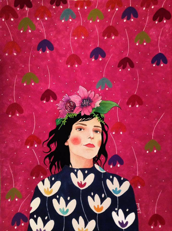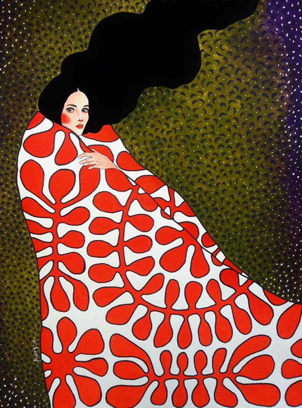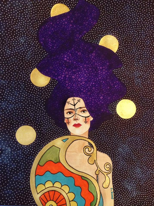 I suoi ritratti sembrano galleggiare in uno spazio tutto loro, tra arte e illustrazione. Le protagoniste sono donne dallo sguardo penetrante e diretto, che quasi sfidano lo spettatore con la loro femminilità forte e vissuta. Alcune vestono un’armatura su uno sfondo rosso sangue e sembrano pronte alla battaglia, altre portano i capelli come una nuvola nera di pensieri pesanti, altre ancora cantano da sole, ma sempre in comunione con la natura astratta che le circonda. Fiori, piante, animali, si dispongono in totale accordo con quanto sembra avere nella mente e nel cuore la loro musa: a volte imperscrutabilmente minimalisti, a volte brillanti e Art Nouveau, altre volte intensi come paesaggi impressionisti di primo Novecento.