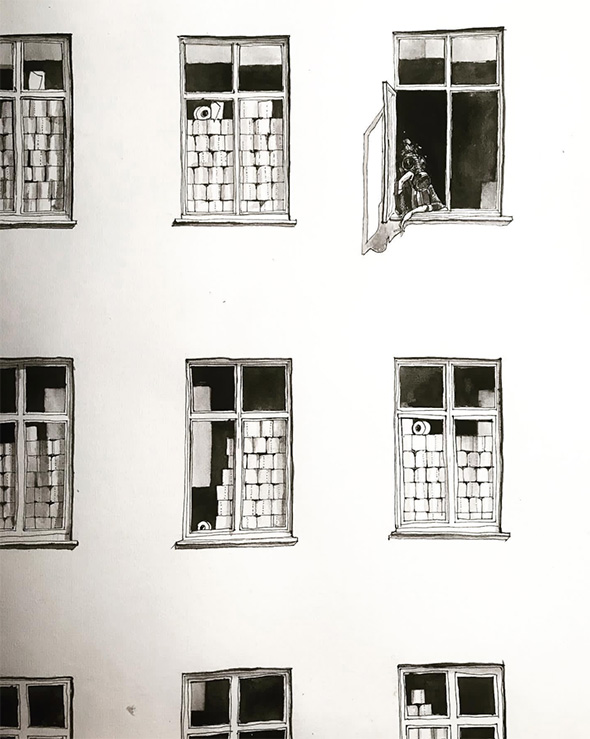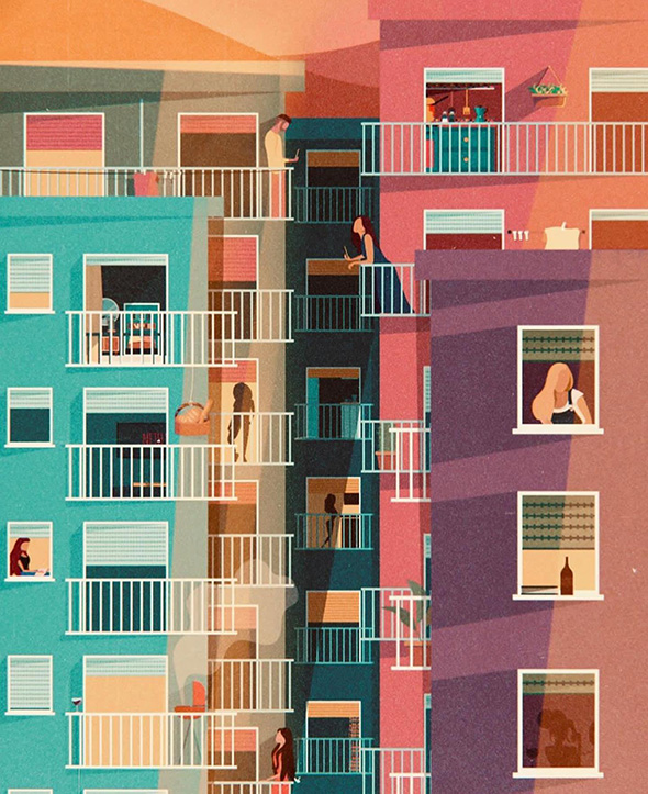 Balconi e finestre sono diventati il simbolo del lockdown dopo i canti e gli abbracci a distanza delle scorse settimane. Hanno ispirato centinaia di artisti, tra cui Paul Blow, Marianna Tomaselli (che ce ne ha parlato qui), Laura Angelucci, Chiara Belmonte, Vincent Mahe e David Bulow.