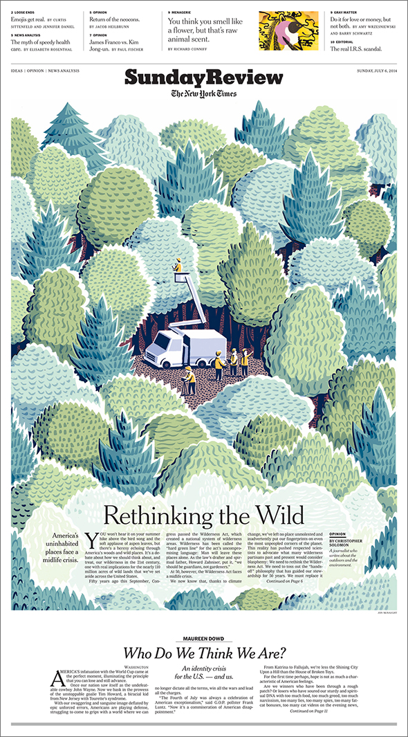 Stanford allowed me to develop my own interdisciplinary major in the humanities, a combination of aesthetics, art history, philosophy and psychology. So since college I’ve been interested in how art can visualize and express complex philosophical concepts. I don’t think it’s necessarily typical for an art director or designer to have an academic background in the humanities, but I think it has been extremely beneficial to my work at the New York Times. Newspapers are inherently interdisciplinary, and having a broad academic foundation has made it easier to art direct articles on a similarly broad range of topics. After graduating from Stanford I worked for a few years at a contemporary art museum in San Francisco, managing their youth art program and designing their marketing materials. From there I ended up at Parsons The New School in New York to study design more deeply, and later worked as a web and book designer at various studios. I now use these skills to design layouts for the editorial and Sunday Review sections at the Times. So the job really is an excellent combination of both my academic and professional interests over the past decade. A weakness I observe in myself is that my design skills are perhaps not as strong or well-rounded as I’d like. This is partially because my formal design education was two years rather than four, so I have a somewhat weaker foundation than other colleagues who received a BFA in design or illustration.