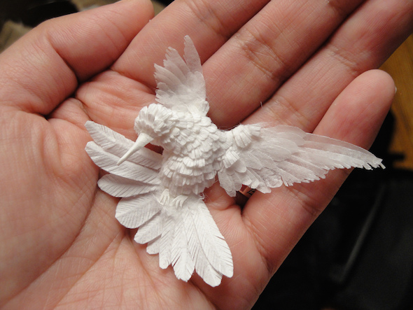 Quello che Cheong-ah Hwang, in arte Papernoodle, riesce a fare con la carta ha più a che fare con la scultura, e la magia, che con il paper-cut. Le immagini sono composte attraverso la sovrapposizione di innumerevoli strati di carta leggera, sapientemente modellata, fino a diventare reali di fronte all’osservatore. Così prendono vita i personaggi della fiabe tradizionali cinesi, Alice davanti al Brucaliffo, e la sorprendente serie di piccoli uccelli bianchi, pronti a spiccare il volo.