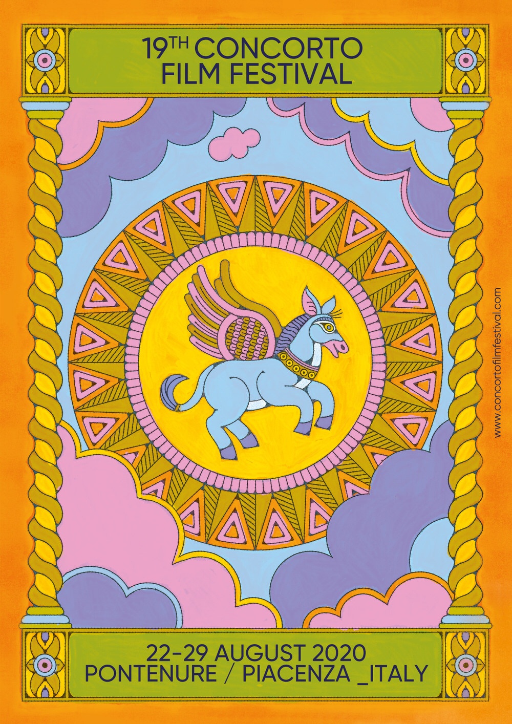 “L’immagine che ho realizzato per Concorto 2022 nasce da un desiderio d’infanzia: cavalcare un animale magico, che sia in grado di staccarsi da terra per condurci verso universi fatati. Ho scelto di rappresentare due ragazzini, li ho immaginati preadolescenti, in quell’età dilatata in cui la dimensione del gioco permea ancora le giornate, ma in cui si affacciano già i primi amori. C’è il sovvertimento delle regole del reale, a partire dal ragazzo che sceglie di cavalcare l’asino al contrario per potersi perdere nello sguardo di lei, al volo quasi inconsapevole dell’animale, che non rientra nell’iconografia tradizionale dell’animale volante munito di ali, ma che si stacca da terra quasi inconsapevolmente, levitando. L’asino è poi bardato a festa, a evocare le sagre di paese del sud Italia, dove viene scelto dai due ragazzini come mezzo incantato per il loro viaggio che ricorda le fuitine del passato” – Elisa Talentino