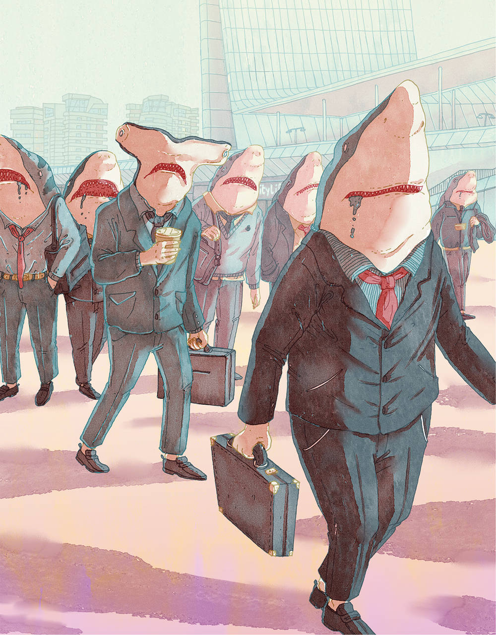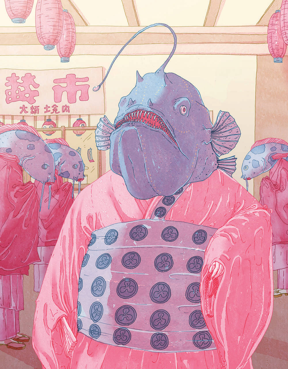 Credo sia stato un modo per definire chi sono come artista. Volevo raccogliere tutti i miei lavori e condividerli con il mio pubblico. Postare un’immagine online non ha lo stesso impatto visivo che vederla stampata su un libro. In più l’immagine digitale tende a svanire nel tempo, sommersa da nuovi ‘post’. Volevo che tutto il mio lavoro, la mia esperienza, i racconti dietro alle mie illustrazioni, riemergessero dalle profondità del digitale e che fossero custoditi dentro un libro. Per questo il mio art-book si intitola ‘Behind the Fish Head’.