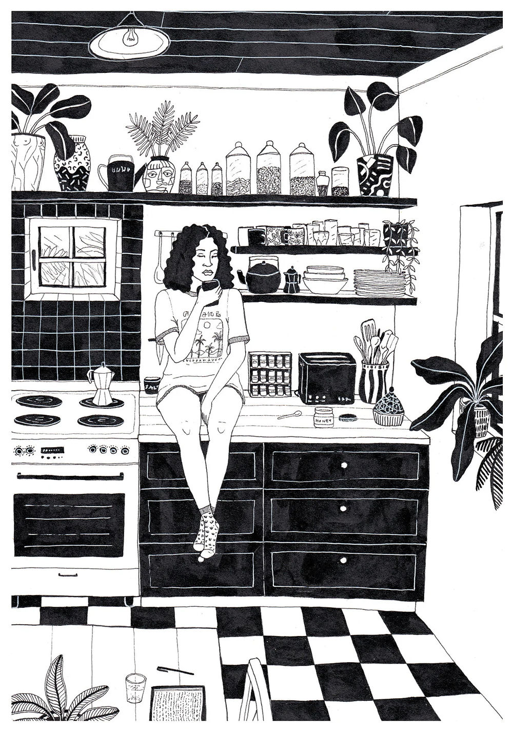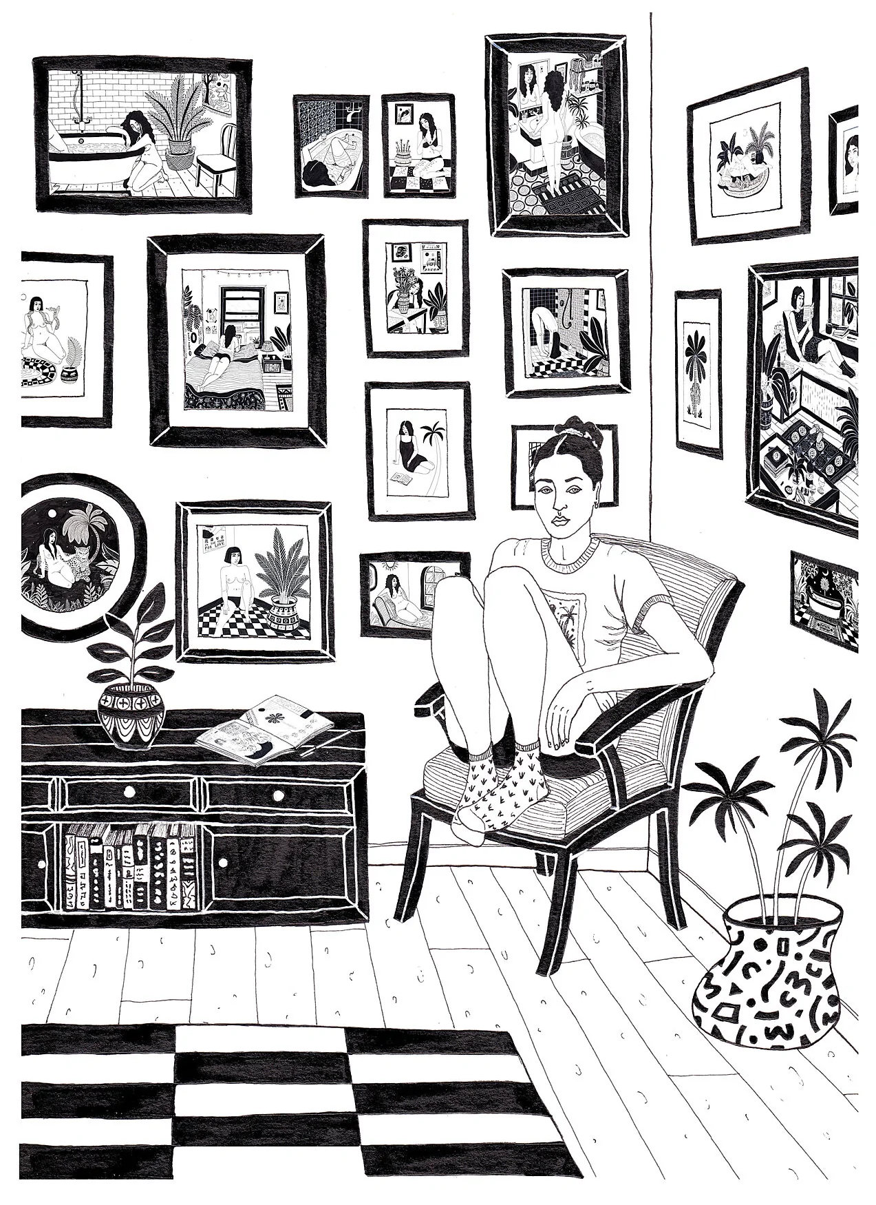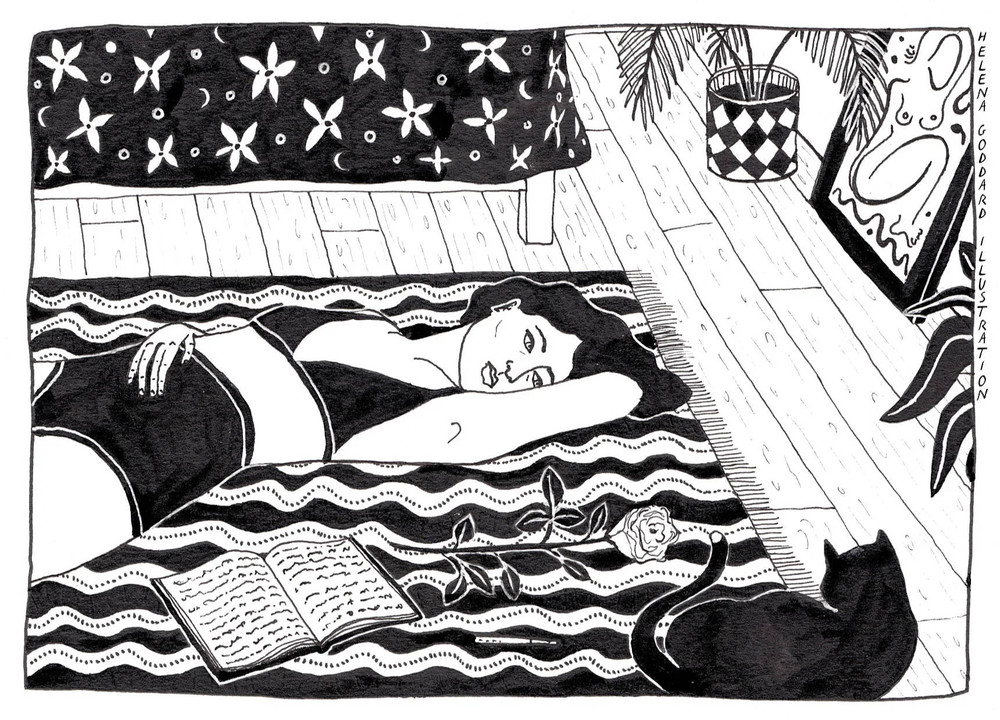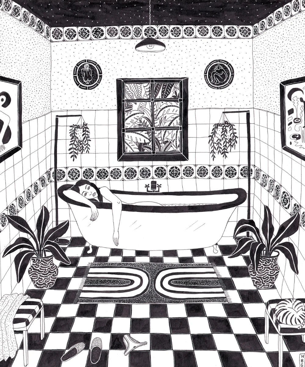 I disegni di Helena sono scene costruite, ricche di decorazioni, rimandi e citazioni. Nonostante la prospettiva degli ambienti sia realistica l’uso del bianco e nero e dei motivi decorativi appiattisce lo spazio e rende importanti i particolari tanto quanto la presenza della donna protagonista.