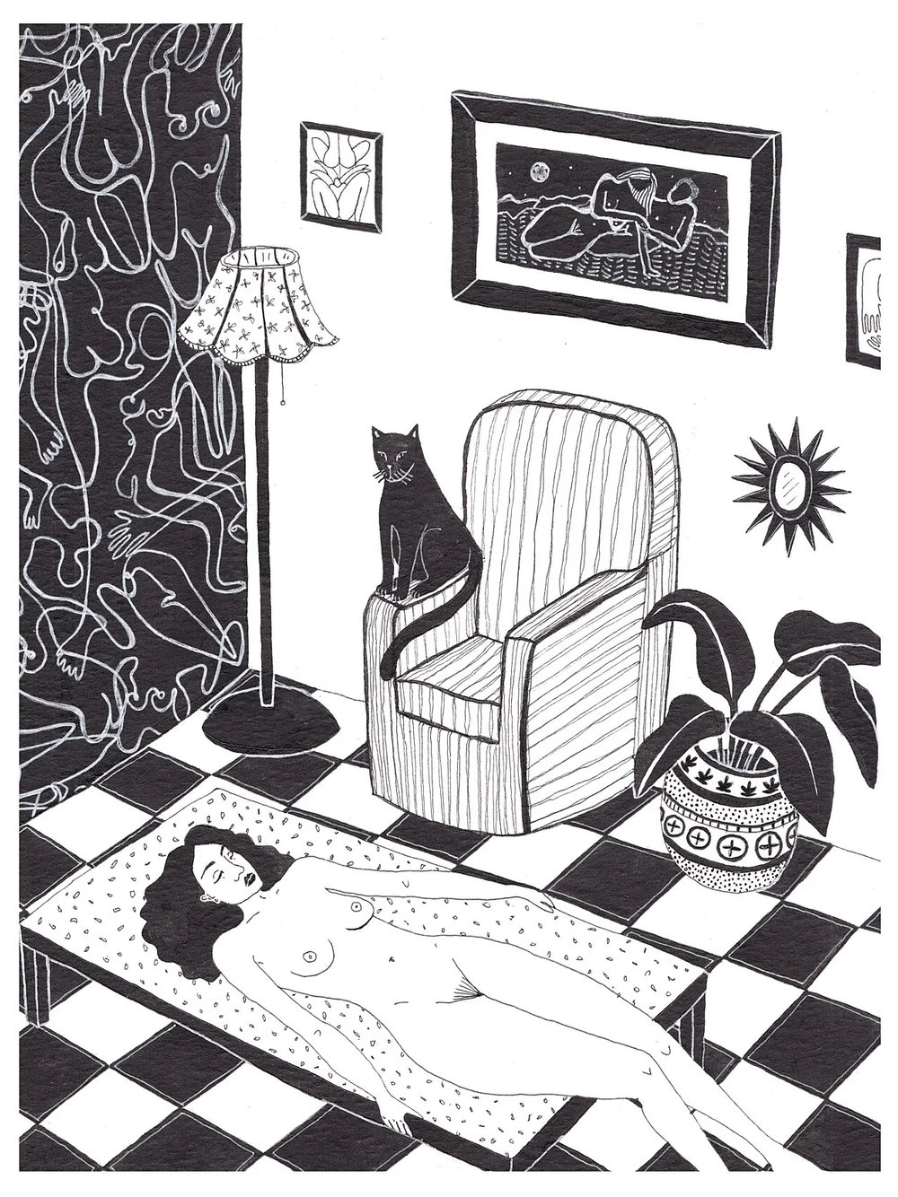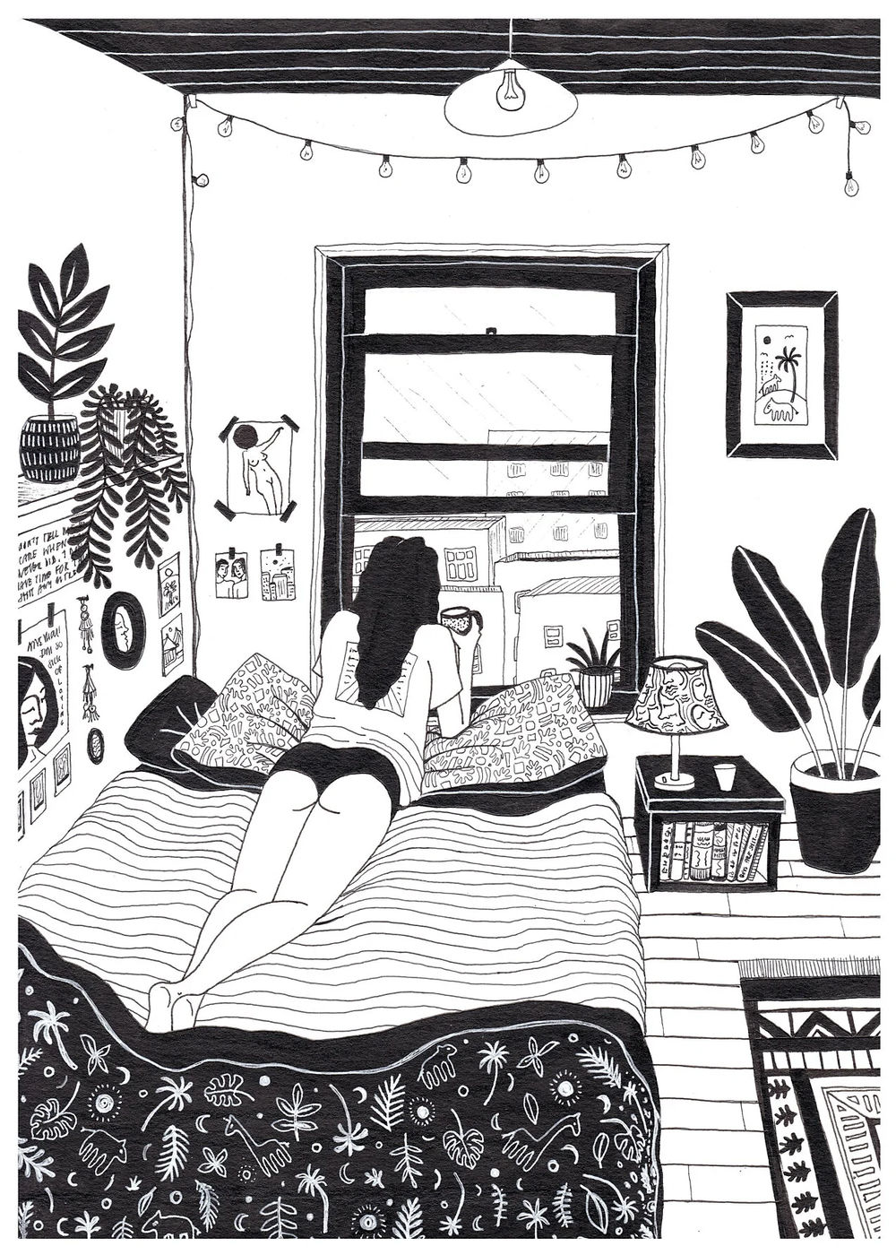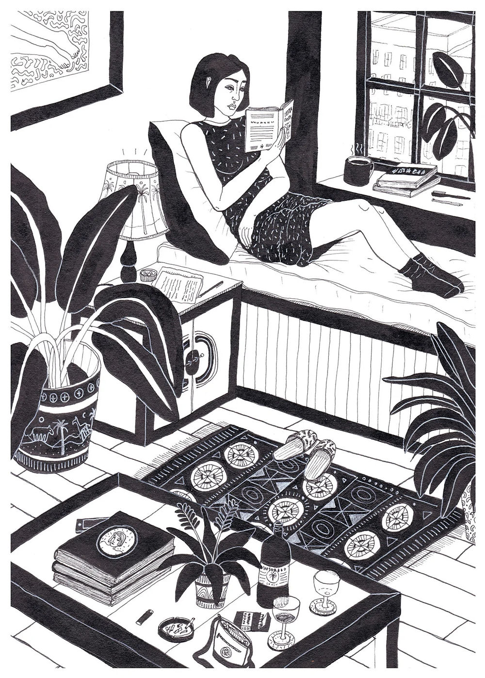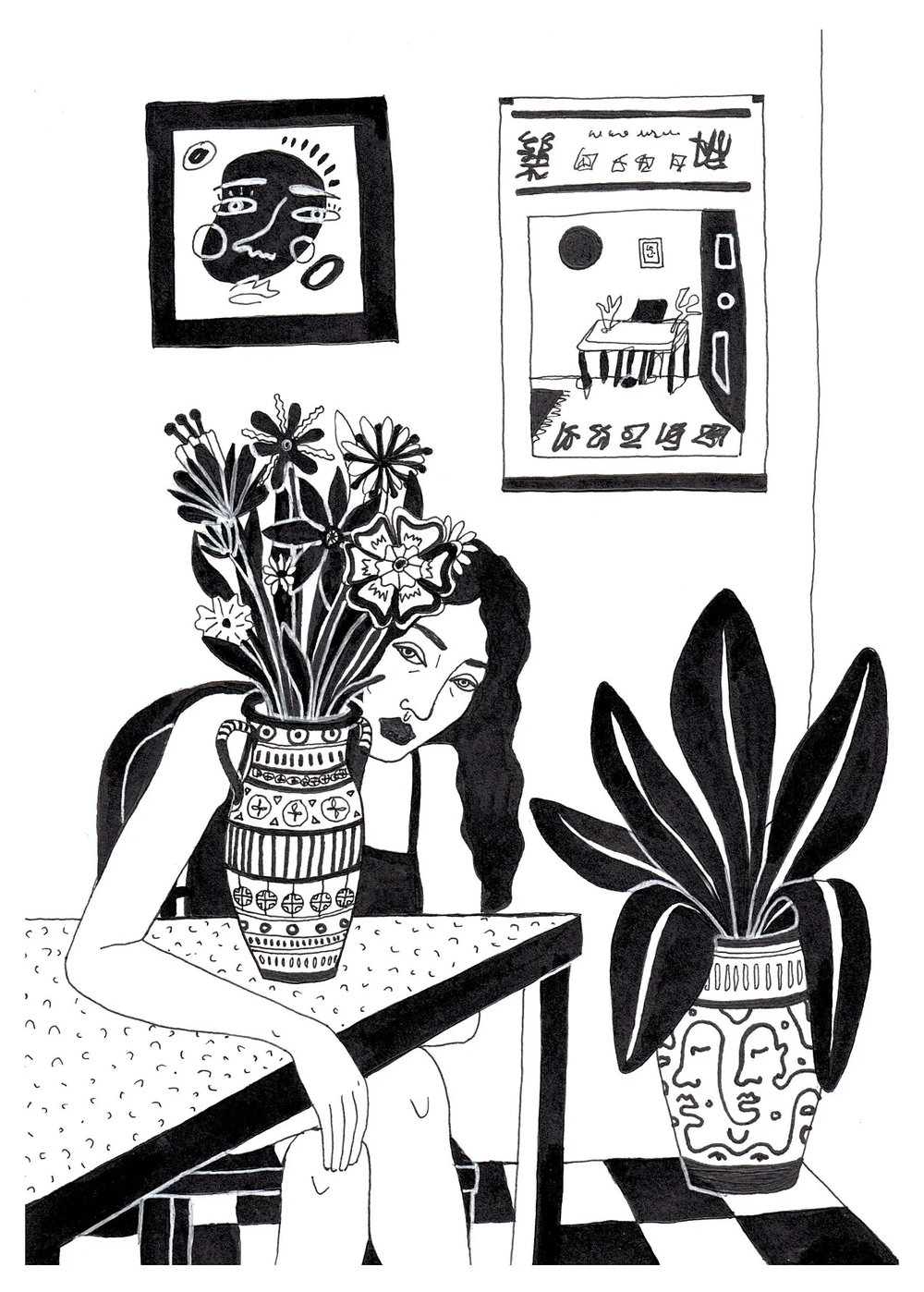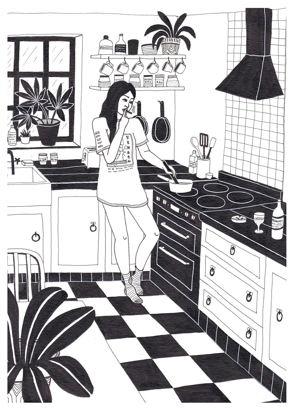 I disegni di Helena sono scene costruite, ricche di decorazioni, rimandi e citazioni. Nonostante la prospettiva degli ambienti sia realistica l’uso del bianco e nero e dei motivi decorativi appiattisce lo spazio e rende importanti i particolari tanto quanto la presenza della donna protagonista.