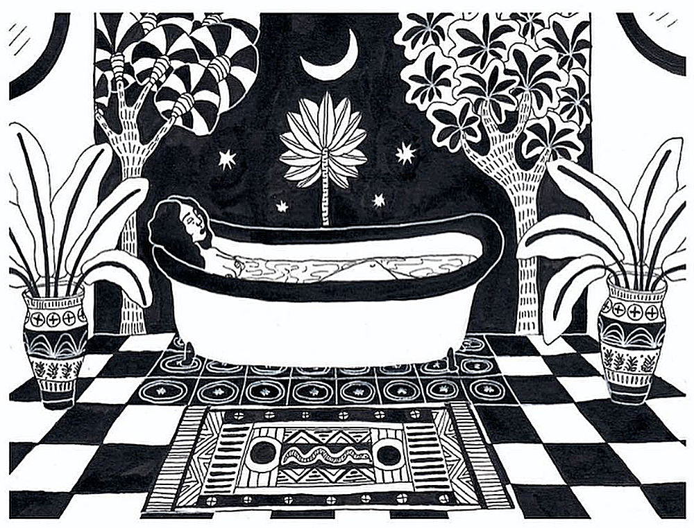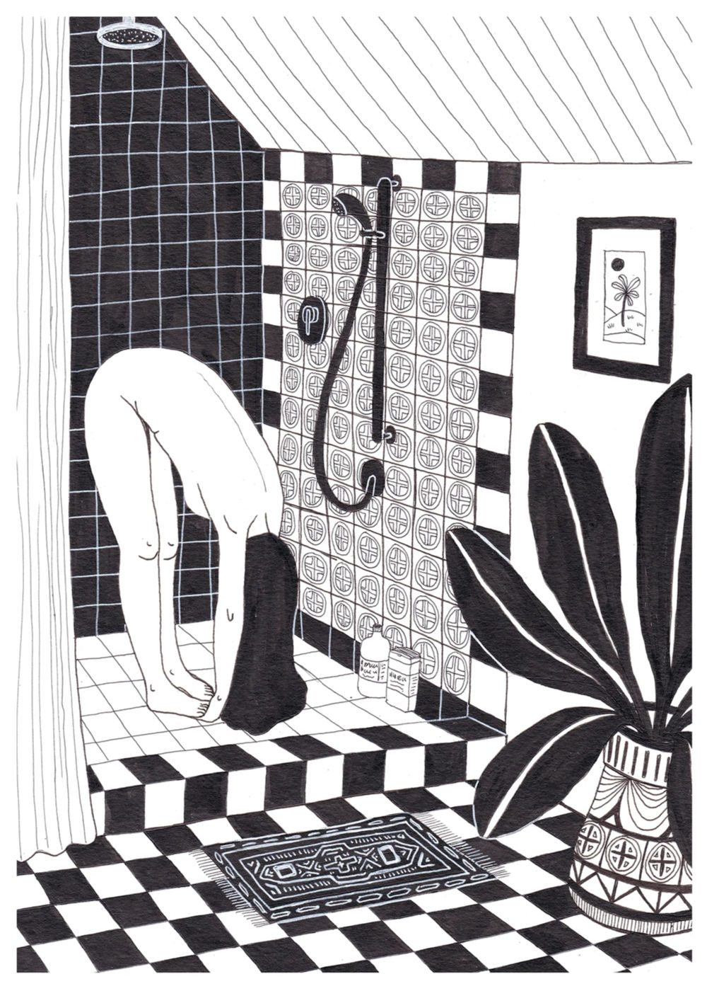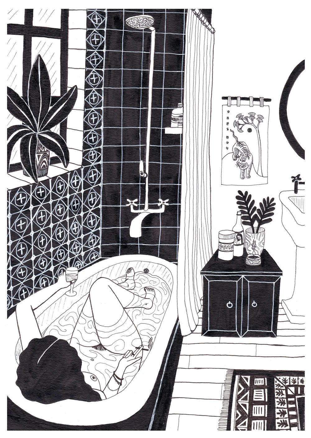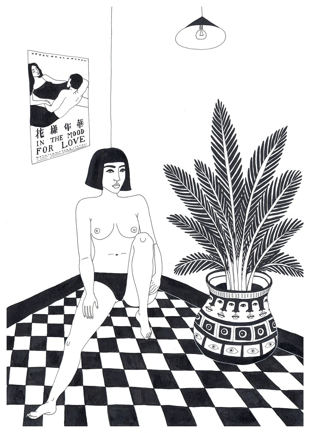 I disegni di Helena sono scene costruite, ricche di decorazioni, rimandi e citazioni. Nonostante la prospettiva degli ambienti sia realistica l’uso del bianco e nero e dei motivi decorativi appiattisce lo spazio e rende importanti i particolari tanto quanto la presenza della donna protagonista.