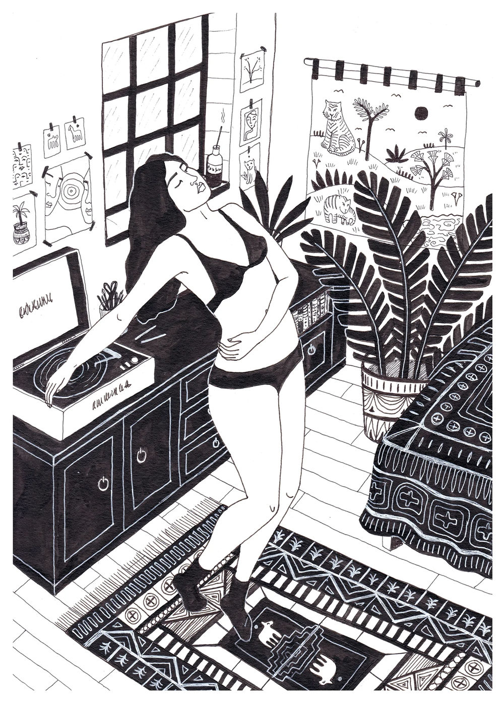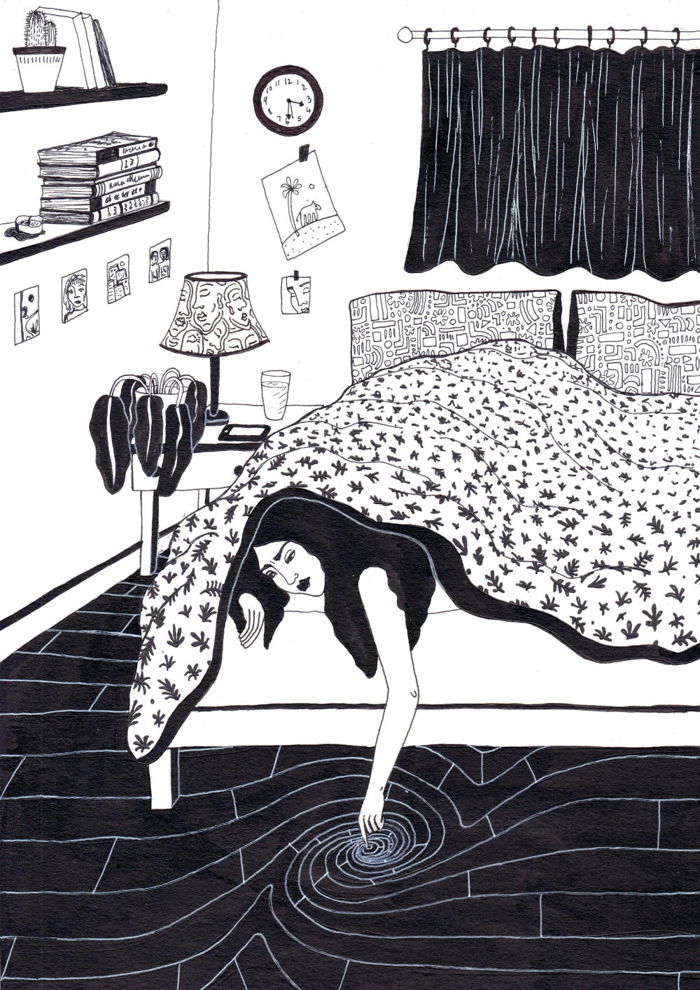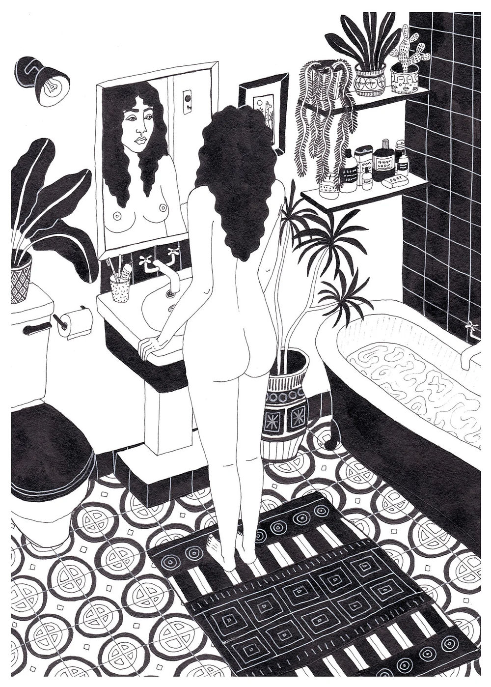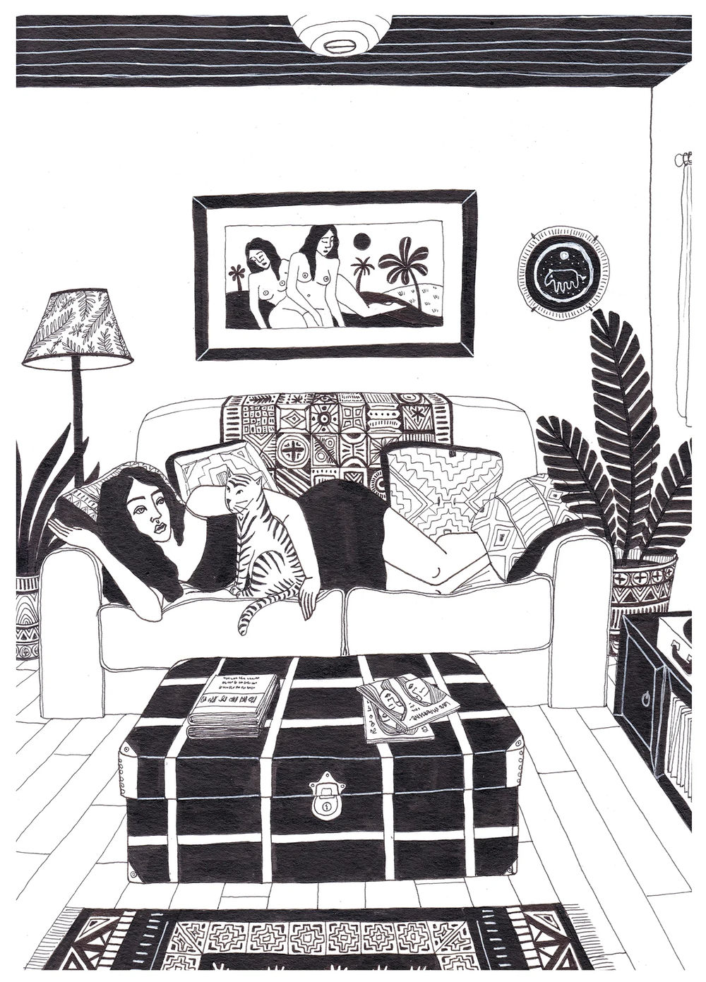I disegni di Helena sono scene costruite, ricche di decorazioni, rimandi e citazioni. Nonostante la prospettiva degli ambienti sia realistica l’uso del bianco e nero e dei motivi decorativi appiattisce lo spazio e rende importanti i particolari tanto quanto la presenza della donna protagonista.