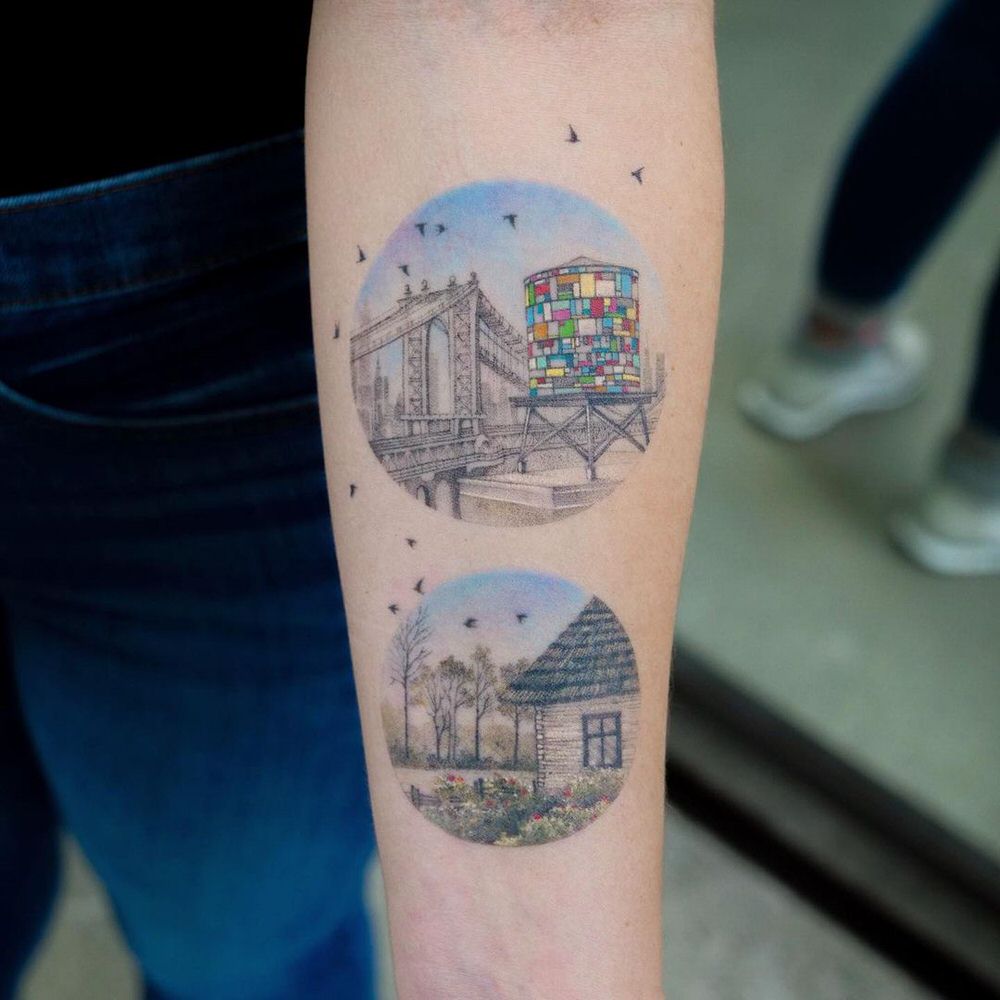 I più particolari sono i tatuaggi tondi, spesso di diametro non più grande di 10-15 centimetri, che come dei piccoli oblò ci permettono di scorgere panorami del tutto unici, principalmente scenari naturali abitati da animali, fiori e volti, intrecciati perfettamente tra loro.