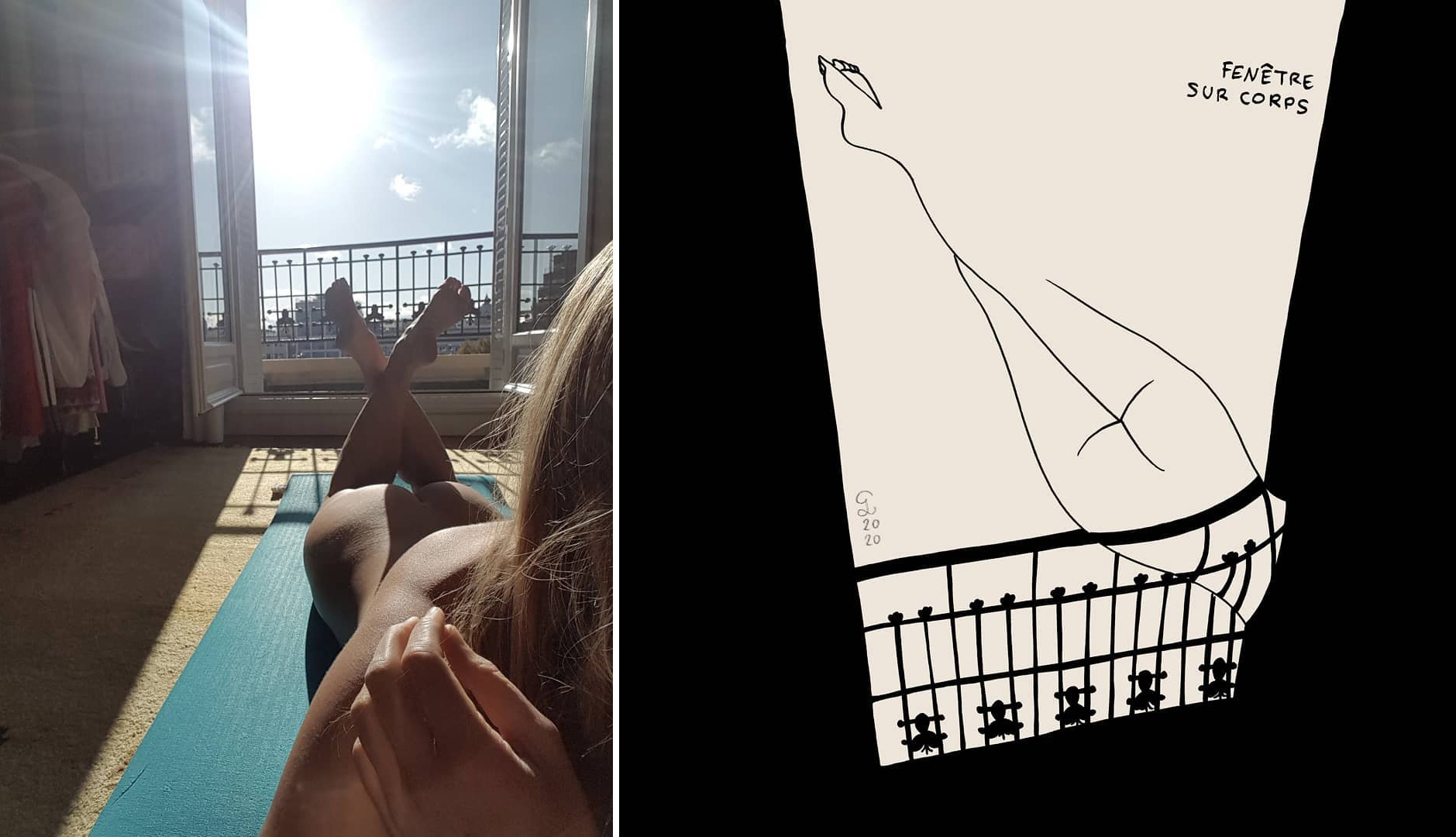 “Helene lives in an appartement in Paris. Sun is bright, but without any garden or balcony, there’s no way to go out and enjoy it. Never mind, she can make the sun come in her appartement! And after all, that allows her to enjoy it a little more than usual… Title is a pun playing with the French title of Hitchcock’ Rear Window, “fenêtre sur cour” meaning “window to courtyard”. I replaced “cour” (courtyard) by the very similar “corps” which means body”.