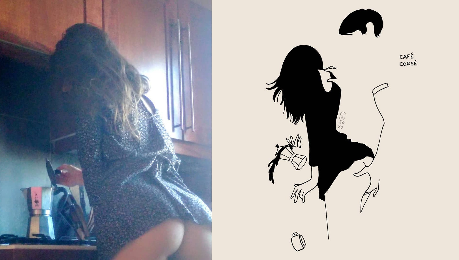 “Méryl lives in Lyon, in a house-share. Her lover does not lives with her during the confinement, so she has to take twists and turns to send him kinky pictures without being caught by her flatmates… So preparing the coffee early in the morning becomes easily a spicy moment! Caption means “strong coffee”, but “corsé” can mean strong (for coffee or spices) but also spicy”.