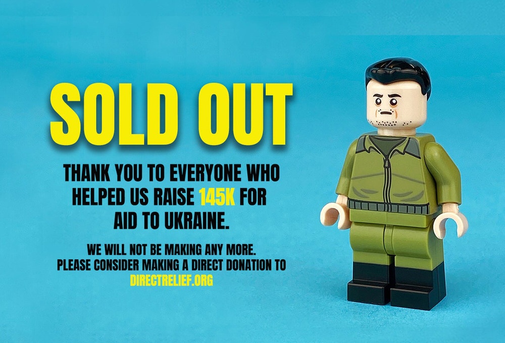 La prima tranche è andata sold out in pochissimo tempo. Il team di Citizen Brick ha così deciso di mettersi nuovamente al lavoro per produrre in tempi record altri “mini Zelensky”, con l’obiettivo questa volta di raccogliere 100 mila dollari in meno di 24 ore. Obiettivo centrato e superato, in base a quanto dichiarato dagli stessi ideatori, che sono riusciti a mettere insieme in tutto oltre 140mila dollari, devoluti poi a Direct Relief ed usati per inviare in Ucraina medicamenti e medicinali salvavita.