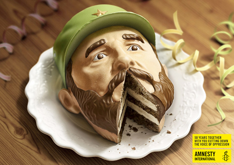 La Euro RSCG, agenzia di marketing con sede a Praga, ha realizzato per il 50° anniversario di Amnesty International, una serie di foto-torta raffiguranti le teste dei dittatori Fidel Castro e Alexander Lukashenko accompagnate dalla scritta “50 years together with you cutting down the voice of oppression“. La campagna mira a focalizzare l’attenzione su quei paesi dove viene negato il più semplice dei diritti: quello alla parola.
