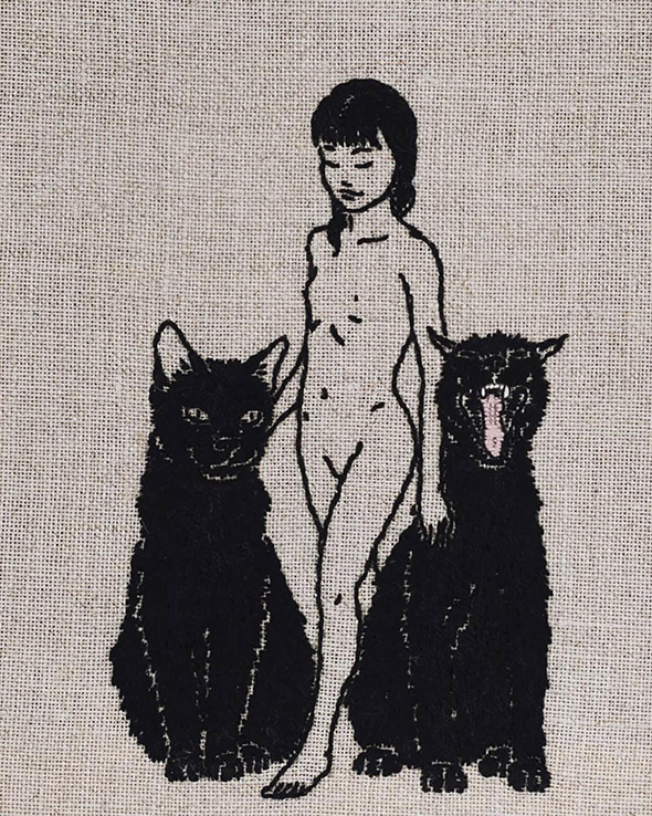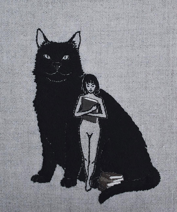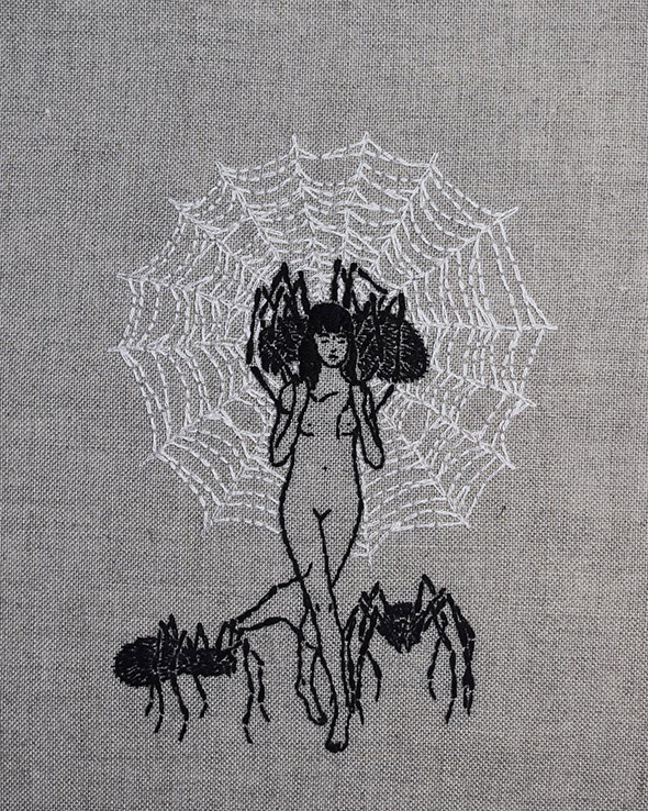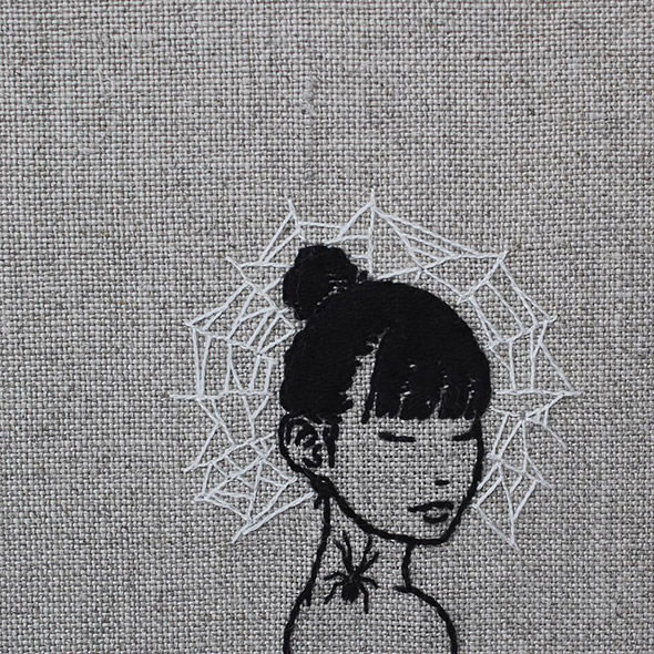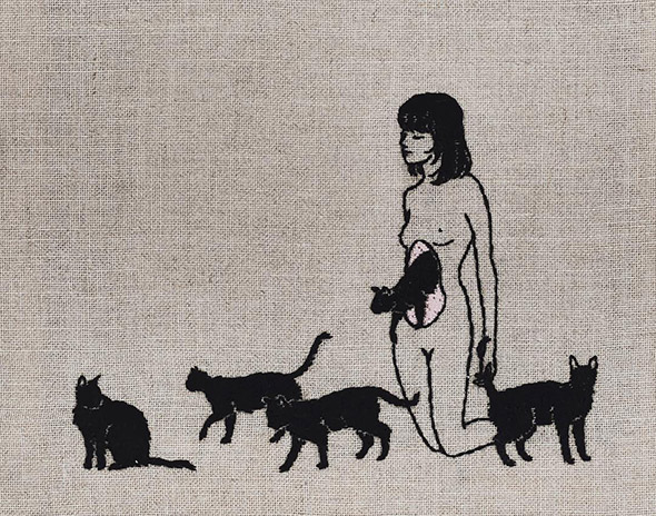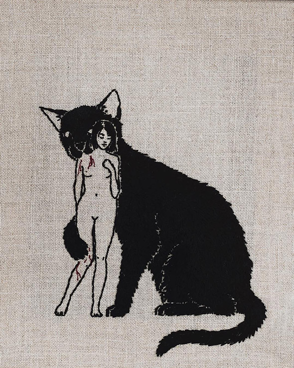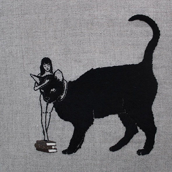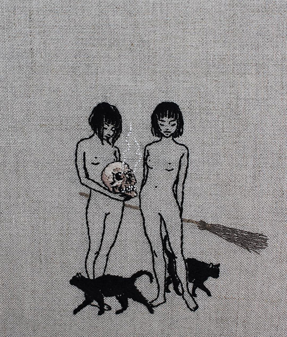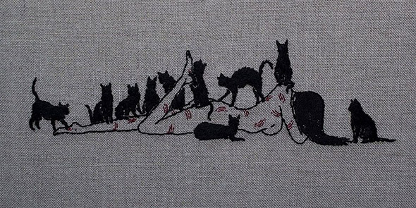 I suoi lavori vengono eseguiti con ago e filo esclusivamente su lino e, all’occasione, su pelle umana, in una emblematica forma di tatuaggio “impermanente”: una sensibilità gotica accompagnata da una vaga attitudine punk. Se la fascinazione per tutto ciò che è lugubre ed oscuro è esplicitamente dichiarata e declinata attraverso i suoi simboli animali (il gatto, il ragno, il pipistrello, il caprone), viene nondimeno accompagnata da una palpabile nota di delicata tranquillità. Serene ed eleganti, le nude protagoniste di questi quadretti si lasciano avvicinare da colonie di felini, aracnidi, teschi e via rabbrividendo senza trasmettere orrore, quanto semmai pace, calma, armonia con l’universo e le sue misteriose, incomprensibili leggi.