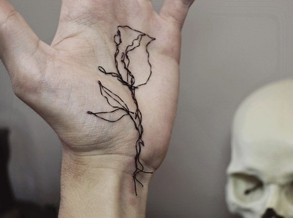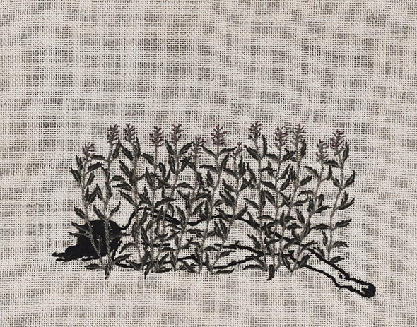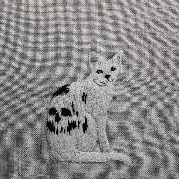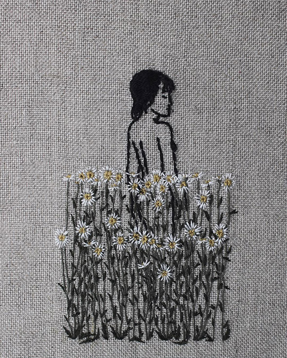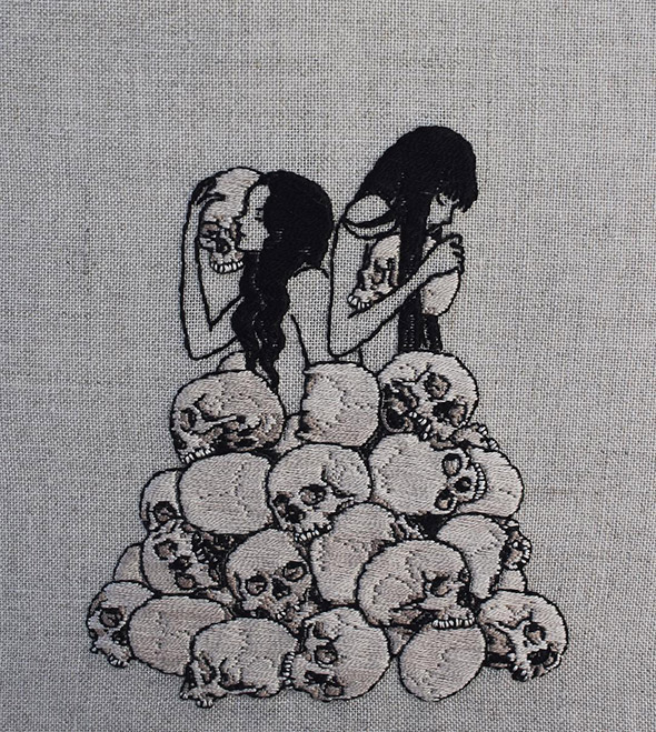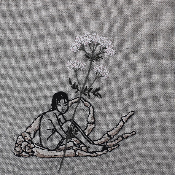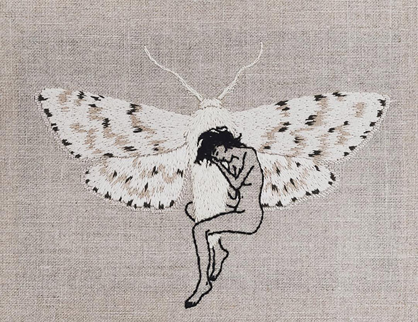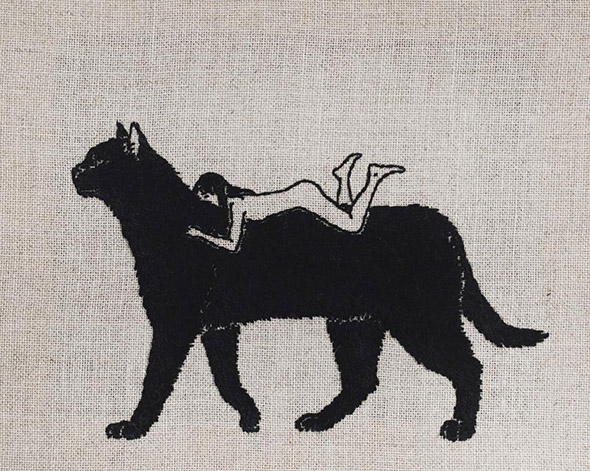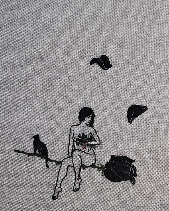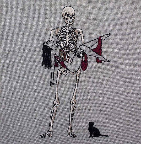 I suoi lavori vengono eseguiti con ago e filo esclusivamente su lino e, all’occasione, su pelle umana, in una emblematica forma di tatuaggio “impermanente”: una sensibilità gotica accompagnata da una vaga attitudine punk. Se la fascinazione per tutto ciò che è lugubre ed oscuro è esplicitamente dichiarata e declinata attraverso i suoi simboli animali (il gatto, il ragno, il pipistrello, il caprone), viene nondimeno accompagnata da una palpabile nota di delicata tranquillità. Serene ed eleganti, le nude protagoniste di questi quadretti si lasciano avvicinare da colonie di felini, aracnidi, teschi e via rabbrividendo senza trasmettere orrore, quanto semmai pace, calma, armonia con l’universo e le sue misteriose, incomprensibili leggi.