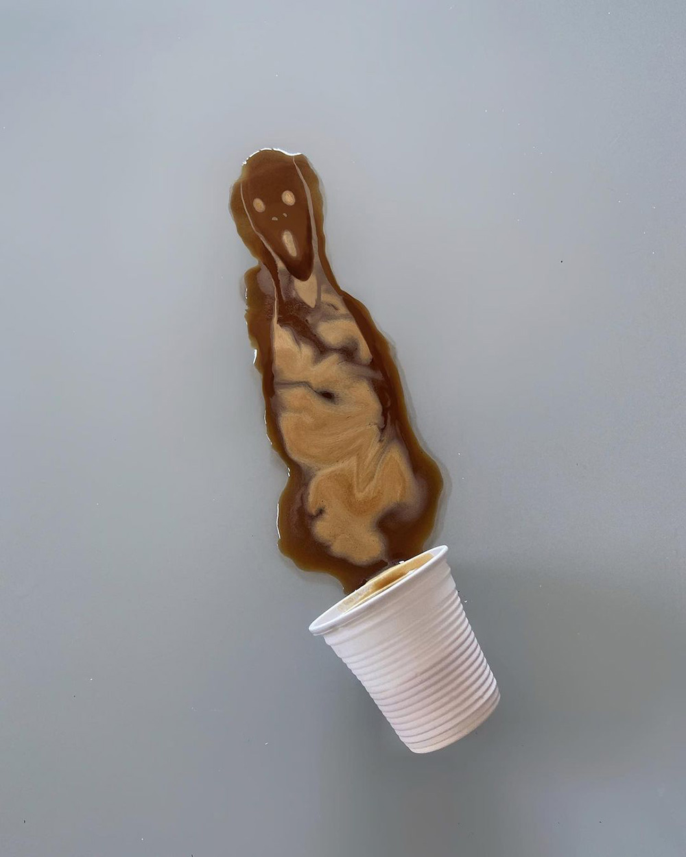 Un uovo il cui tuorlo è un feto; un caffè rovesciato che rivela “L’Urlo” di Munch; screenshot di conversazioni che raccontano con sarcasmo attimi della vita di ognuno di noi. Ma anche opere in larga scala, esposizioni e mostre internazionali, collaborazioni con importanti brand di moda.
