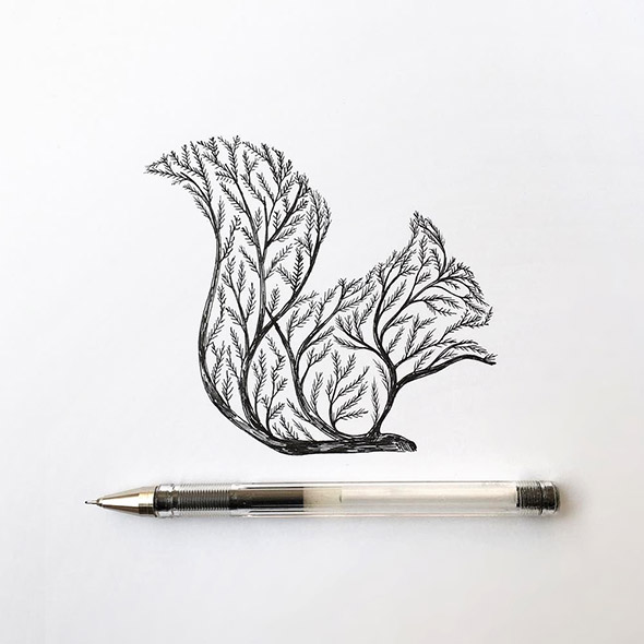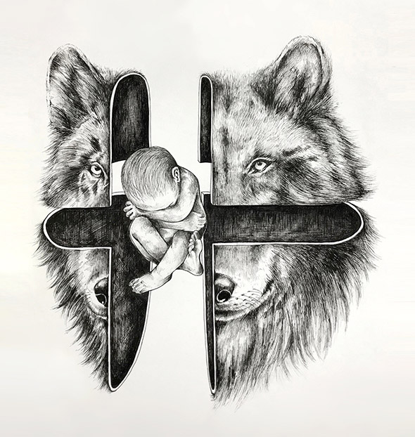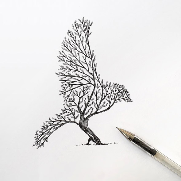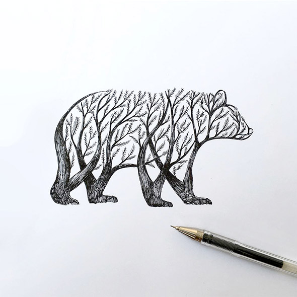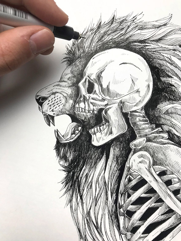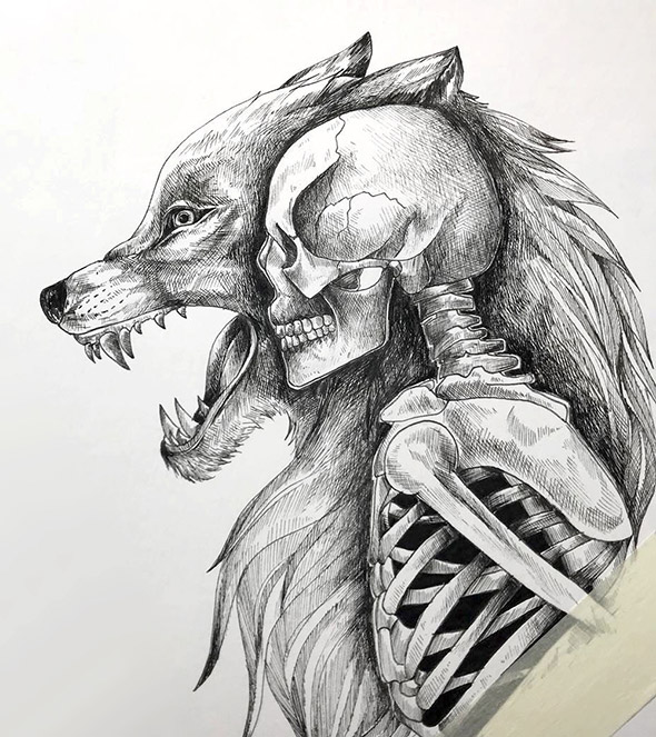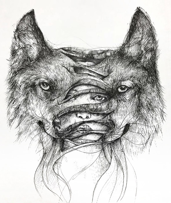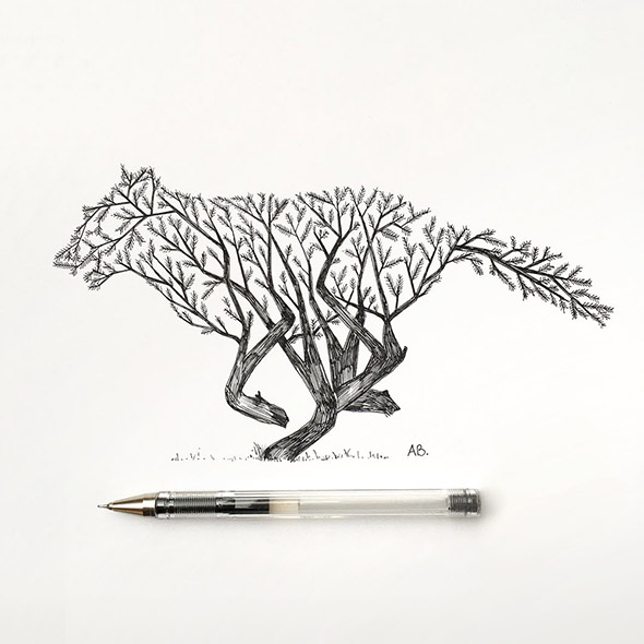 L’equilibrio tra la natura e l’uomo e sempre più critico e difficile. Eppure, sebbene ci consideriamo creature civilizzate, siamo ancora spiriti selvaggi. Gli animali ci guidano alla scoperta del nostro vero io interiore e alla comprensione dell’ordine naturale delle cose, tra armonia e disciplina.Questo, in sintesi, è il messaggio che Alfred Basha vuole esprimere attraverso il tratteggio in bianco e nero dei suoi disegni, realizzati esclusivamente con penna e inchiostro nero. Semplice, elementare, potente e fiducioso. Gli scheletri umani che prendono il posto di quelli animali, infatti, non evocano la morte, ma sono la rivelazione della nostra vera anima. Così come, in altre illustrazioni, le sagome degli animali si fondono con gli alberi della foresta.