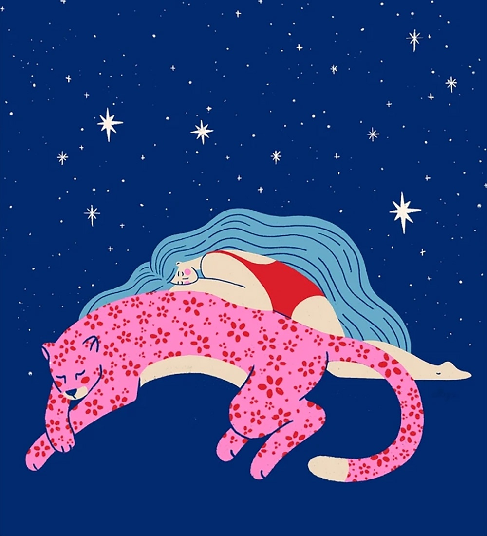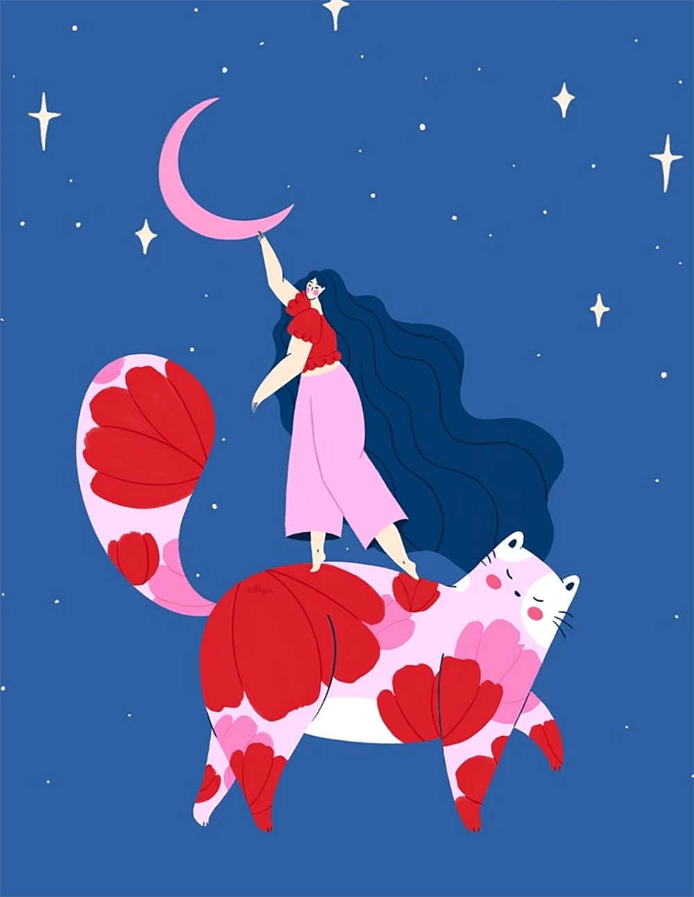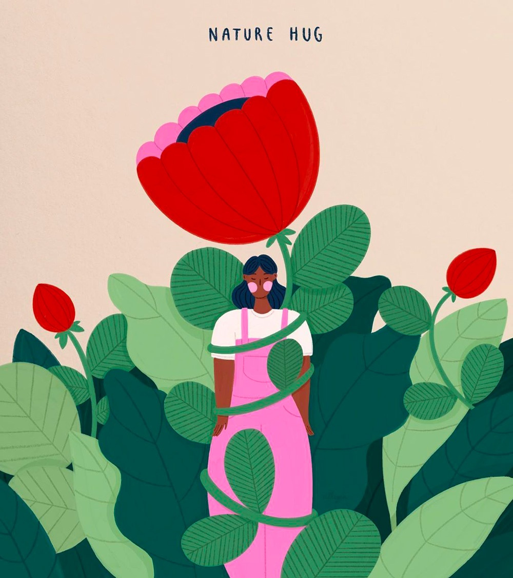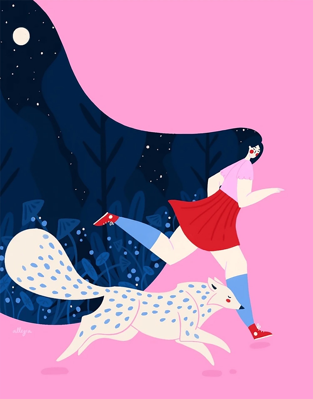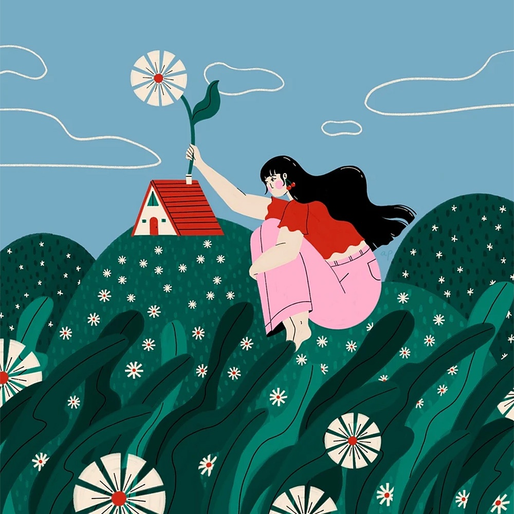 Le illustrazioni di Allegra Parlavecchio sprizzano positività da ogni dettaglio. È come se guardassimo la realtà attraverso gli occhiali rosa dell’ottimismo e tutto diventasse un piacevole sogno ad occhi aperti. I compagni di viaggio delle protagoniste sono fiori, piante e animali, giganti buoni di una favola alla Alice nel paese delle meraviglie. La loro dimensione fuori scala sembra volerci ricordare quanto siamo piccoli di fronte alla grandezza della natura e dell’universo, senza la drammaticità dei romantici ma semmai come espediente per esprimere il desiderio di essere parte di questa bellezza.