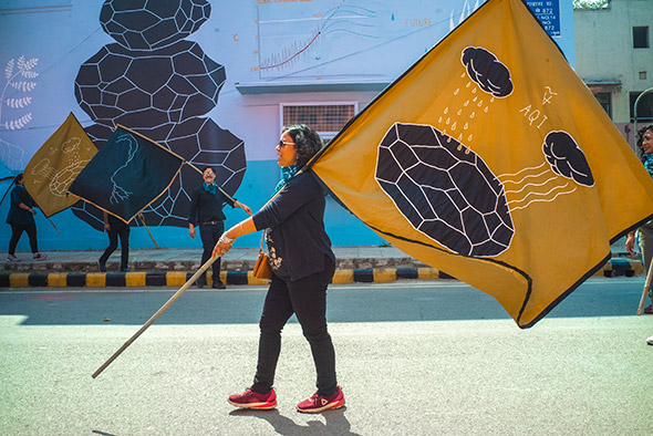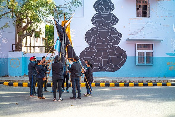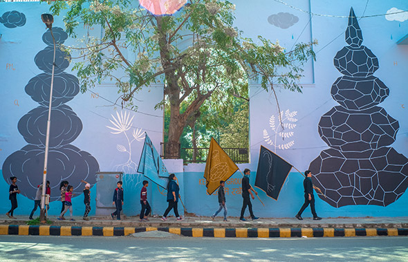 Il progetto si compone di vere e proprie azioni: murales, ma anche performances, installazioni e sculture. Nel caso di Nuova Delhi si è trattato di un murale, una parata (compiuta da giovani e giovanissimi residenti del quartiere) e una conferenza sul tema aperta alla cittadinanza. Il tutto realizzato all’interno del Lodhi Art Festival 2019 organizzato da ST+ART India Foundation in collaborazione con l’Istituto italiano di Cultura.