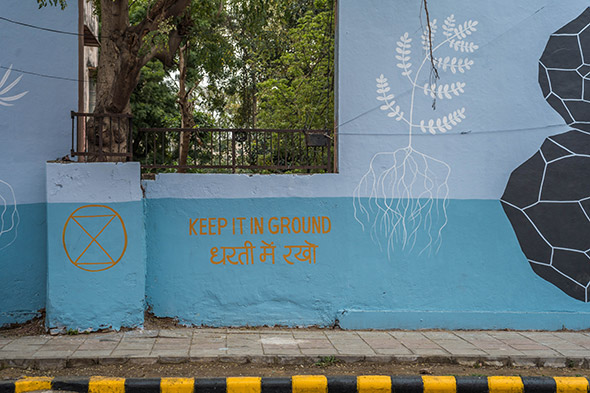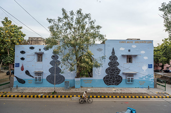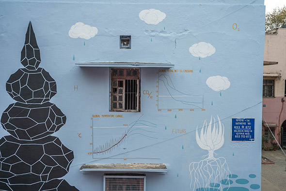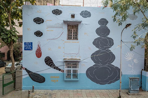 Nello specifico il murale, ispirato dagli scritti dell’autore indiano Amitav Ghosh e il movimento internazionale “Extinction Rebellion”, è stato dipinto utilizzando i colori AIR-INK, realizzati riciclando la PM 2,5 – inquinante prodotto in atmosfera dagli scarichi industriali. E così, i suoi caratteristici prismi neri e le sue formule chimiche contrastano la parete di una costruzione dai colori sgargianti com’è tipico dei quartieri popolari indiani. In questo modo l’artista è riuscito a far passare il messaggio di poter limitare gli effetti di una polvere a granulometria fine, capace di penetrare nei polmoni, riutilizzandolo al servizio dell’arte. Coerenza di forma e contenuto quindi, ma anche di tecnica.
