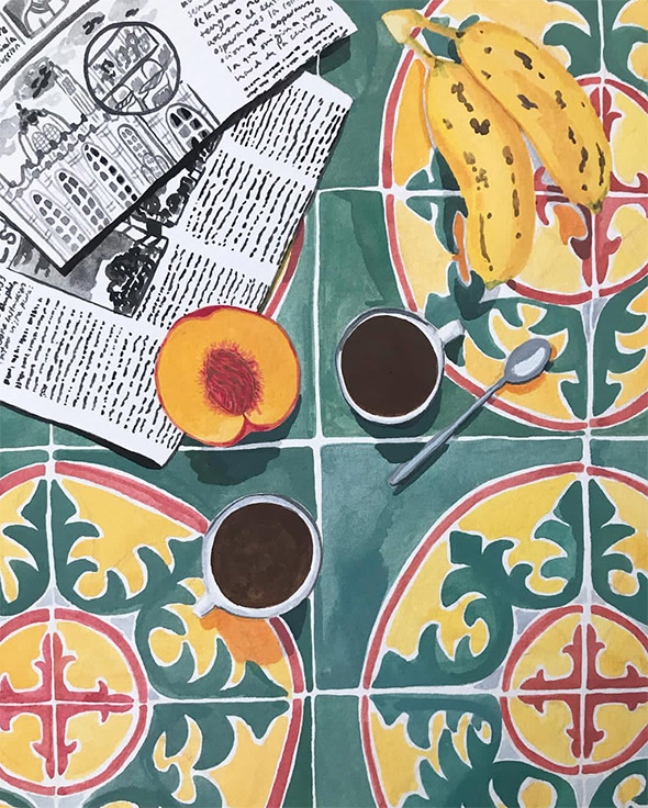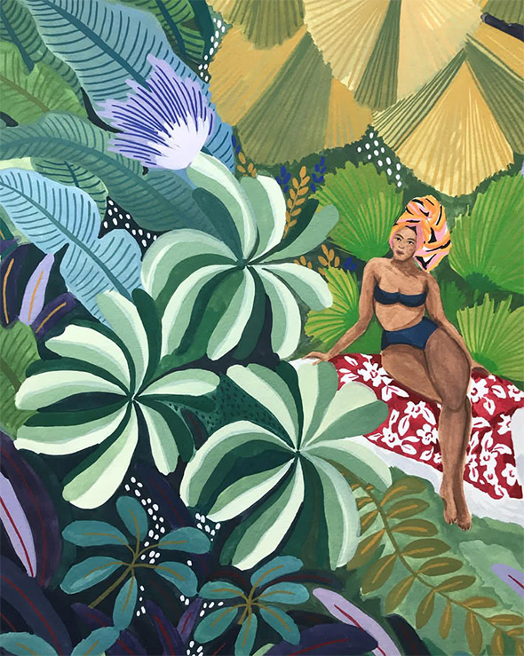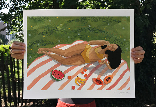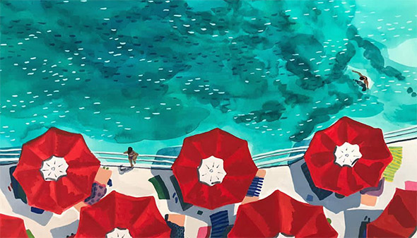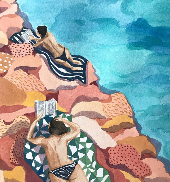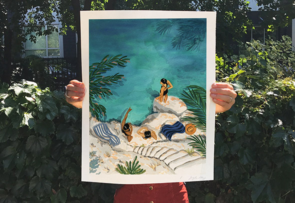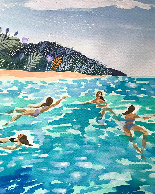 Verde smeraldo, azzurro, giallo dipingono scene estive, marine e solari nelle illustrazioni di Angela Mackay. Poster, piccole cartoline, appunti, cornici dei suoi vari pellegrinaggi in giro per il mondo e tante altre meravigliose suggestioni: guardare i suoi lavori è come spiare uno scorcio di realtà, calda ed accogliente, fatta di tratti leggeri dati con gli acquerelli.