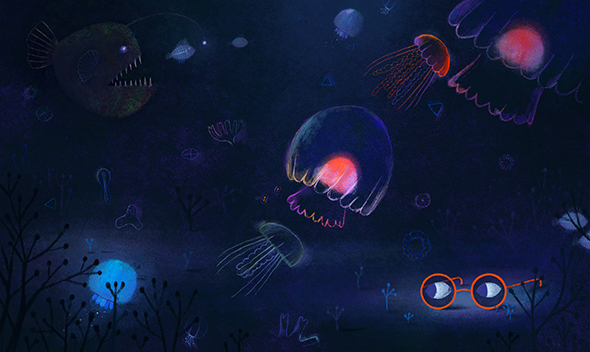 L’header che ci ha voluto regalare esprime in modo sintetico proprio questo insieme di caratteristiche. E visto che siamo in estate Anna ha utilizzato la profondità del mare come metafora del nostro mondo interiore, ricco di creature tanto delicate e fragili quanto misteriose e spaventose. Gli occhiali che incorniciano lo sguardo somo il particolare rivelatore che diventa la chiave di lettura di cui parlavo prima. È il suo autoritratto ma, al tempo stesso, è il nostro sguardo che spia e osserva il mistero del nostro inconscio. E, infine, può anche essere la metafora dell’illustrazione: l’unico strumento che, attraverso la creatività, la fantasia e la sensibilità, riesce a farci vedere con occhi nuovi luoghi del mondo o della mente dove diversamente non potremmo arrivare.