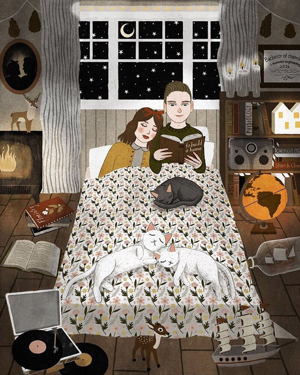 Scene di serenità domestica e coperte patchwork conferiscono un certo nordico hygge al mondo già intimamente perfetto di Annya Marttinen