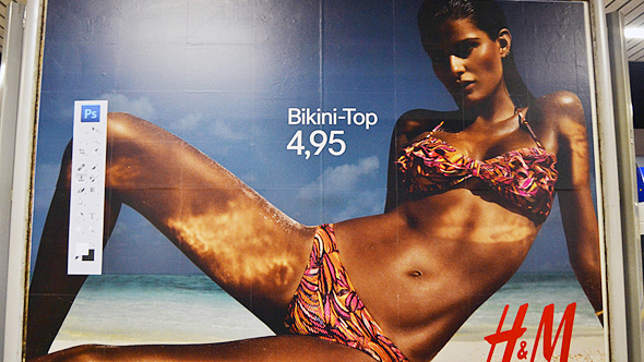 Gridare allo scandalo di fronte all’ennesima campagna iperphotoshoppata di qualche multinazionale dell’abbigliamento, ormai, è fiato sprecato. Ne abbiamo viste di tutti i colori (letteralmente), ultimo in ordine di tempo il caso che vede la fotomodella Isabeli Fontana comparire sui manifesti H&M con un’abbronzatura a dir poco preoccupante… Un anonimo ed acuto artista tedesco non è rimasto a guardare ed ha deciso di lanciare un messaggio chiaro ed inequivocabile: ha appiccicato sui manifesti sparsi per la città di Amburgo la famosa toolbar di Photoshop suscitando ilarità ma fornendo al contempo uno spunto di riflessione.