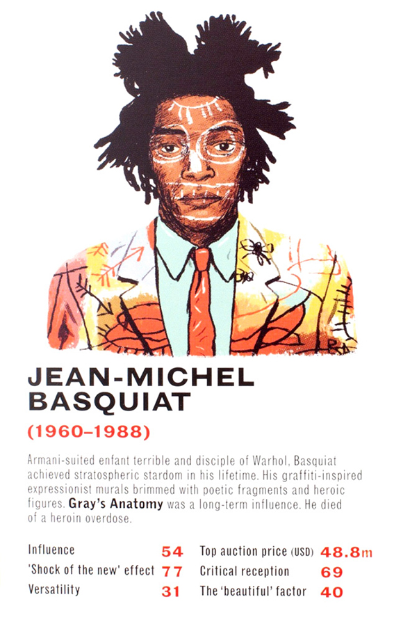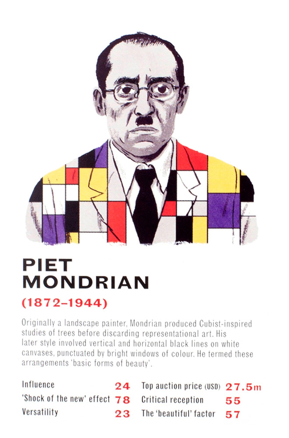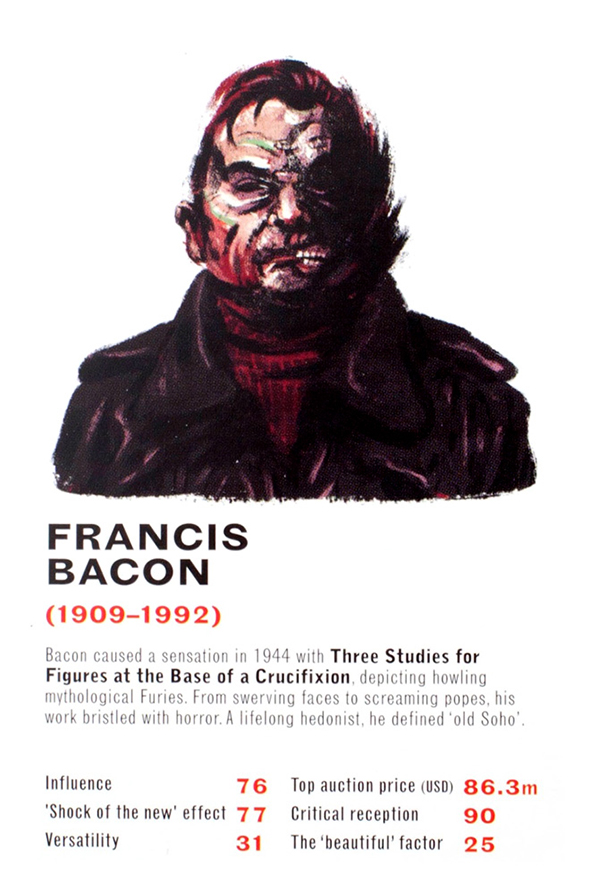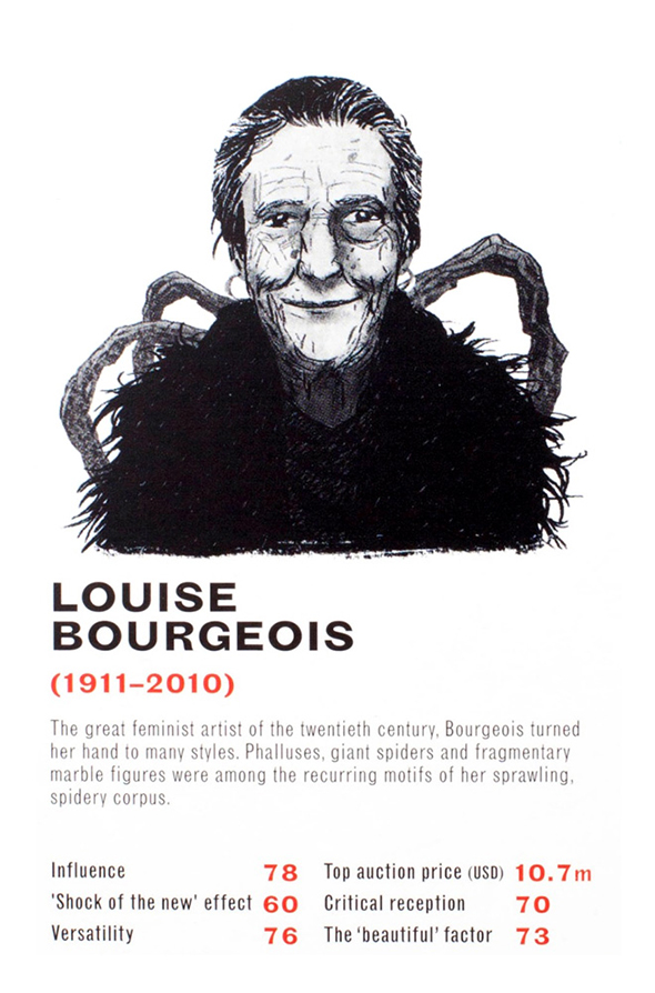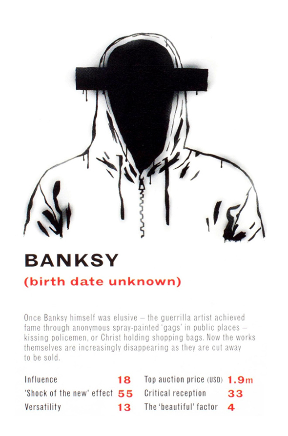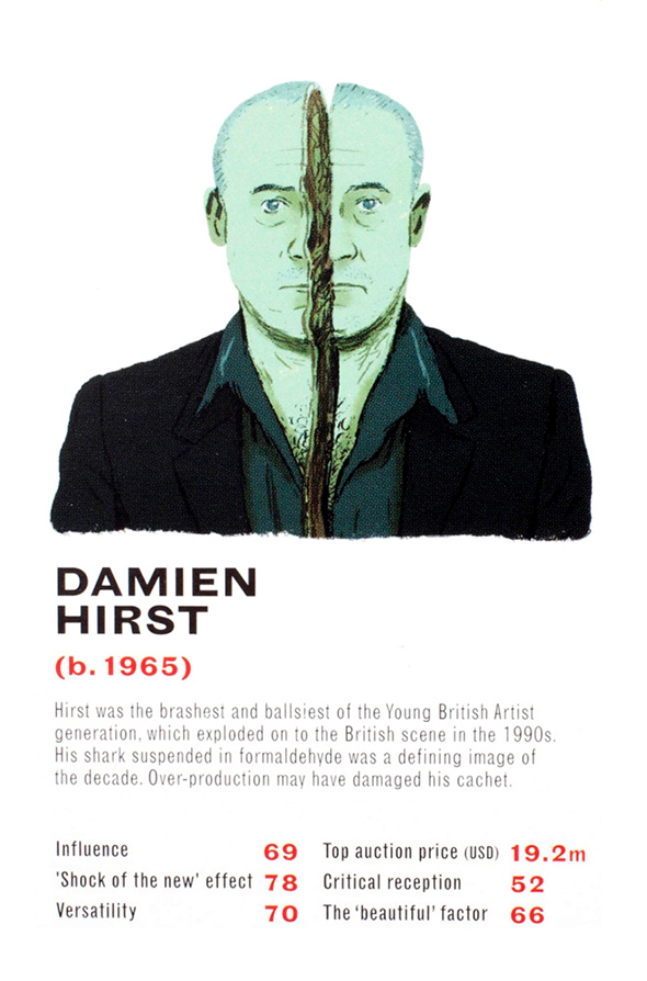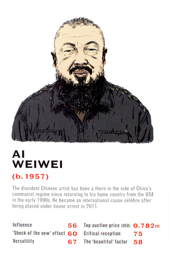 Il critico d’arte londinese James Cahill e l’illustratore danese Mikkel Sommer hanno realizzato un mazzo di carte raffigurante 32 artisti tra i più leggendari. Ci si sfida confrontando dati statistici legati a sei elementi fondamentali per il mondo dell’arte: l’influenza sulla società e sulle correnti artistiche contemporanee e postume, l’effetto “shock of the new”, la versatilità, il prezzo d’asta, la risposta benevola della critica e l’imprescindibile valore estetico delle opere. Tra gli artisti raffigurati: Picasso, Damien Hirst, Francis Bacon, Ai Wei Wei. Il mazzo è acquistabile per poco meno di 10 sterline sul sito dell’editore Laurence King.