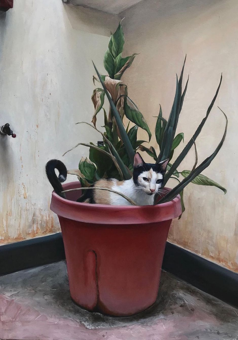 Contemporanei e sempre legati al mondo reale, i temi delle sue opere si contrappongono e al contempo si completano magnificamente grazie alla tecnica e al finish su tela. I dipinti a olio si rifanno ai giochi di luci e ombre tipici delle arti figurative dei secoli scorsi, legate al vissuto personale dell’artista, che spesso li “contamina” con la pittura spray, la stessa usata per le opere murarie, creando una commistione tra passato e presente.