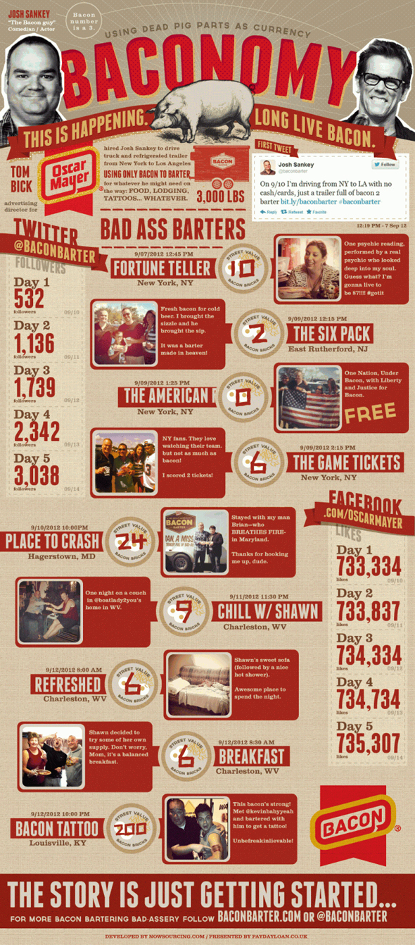 E’ possibile vivere, o meglio sopravvivere, usando come unica valuta il bacon? Josh “The Bacon Guy” Sankey è convinto di si e per questo si è messo in viaggio per gli Stati uniti senza un soldo in tasca ma con una discreta scorta di dead pig parts used as currency (per la precisione 3000 libbre). Un’infografica ci riassume i punti salienti dell’impresa, i risultati ottenuti e la smisurata crescita dei followers. Long live Bacon.