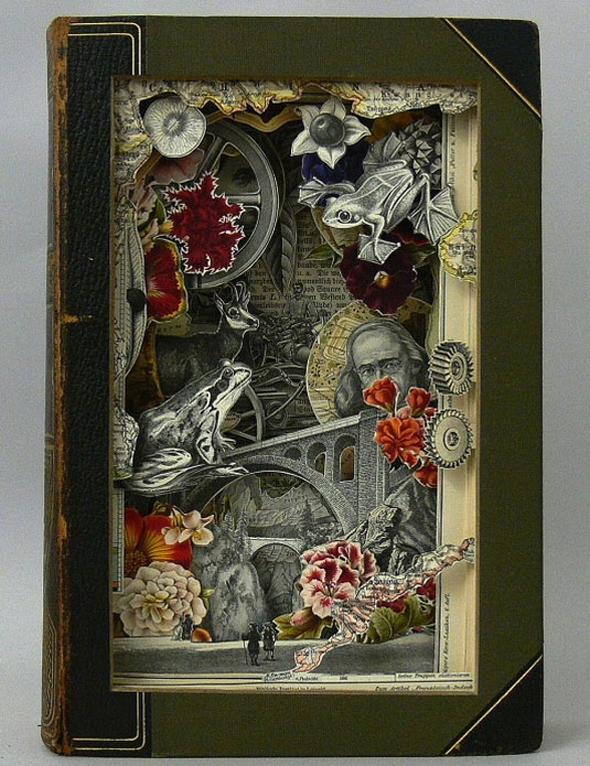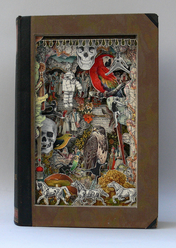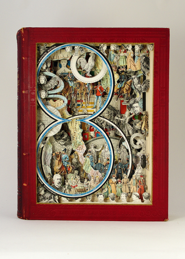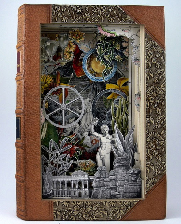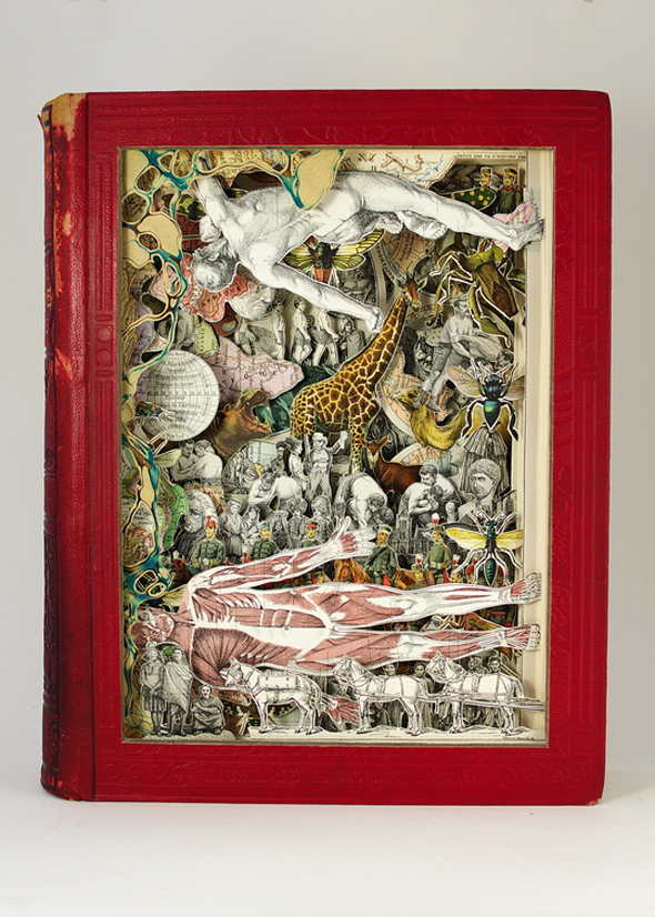 Alexander Korzer-Robinson possiede nell’ordine: un talento fenomenale, tonnellate di pazienza, una grande passione per il proprio lavoro ed, infine, un bisturi affilatissimo. Usando come base vecchi libri illustrati e volumi dell’enciclopedia, ritaglia le pagine una dopo l’altra, lasciando solo le illustrazioni che sono importanti per la narrazione. In questo modo crea affascinanti opere d’arte tridimensionali che raccontano storie e svelano mondi nascosti.