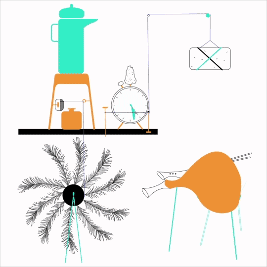 Animazione della Macchina per addomesticare le sveglie ideata da Bruno Munari e contenuta nel suo libro Le macchine inutili, del 1942.
