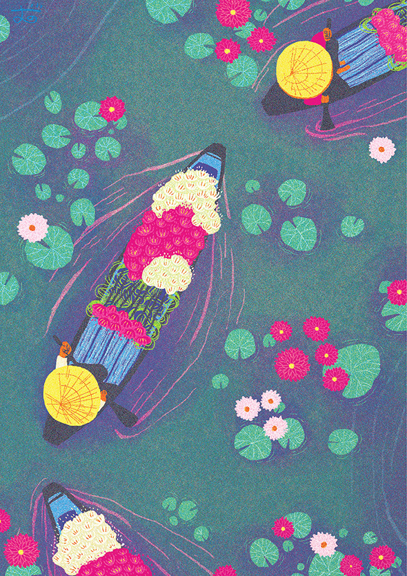 Le sue coloratissime, surreali ed enigmatiche visioni non prendono spunto dalla realtà ma vanno dritte alla scoperta della natura più profonda delle cose e delle persone. Sono la rappresentazione simbolica e poetica del suo mondo interiore e delle sue emozioni più intime. Realizzati con tavoletta grafica e Photoshop, guardando i suoi lavori abbiamo l’impressione di riconoscere anche la nostra anima, come se ci stessimo guardando in uno specchio. In apparente contraddizione con questa ricerca, Camelia ha realizzato una serie di illustrazioni realistiche che celebrano i luoghi più famosi e suggestivi del Vietnam, ma anche in questo caso i suoi delicati paesaggi sono in realtà luoghi dell’anima ricchi di nostalgia per la terra d’origine.