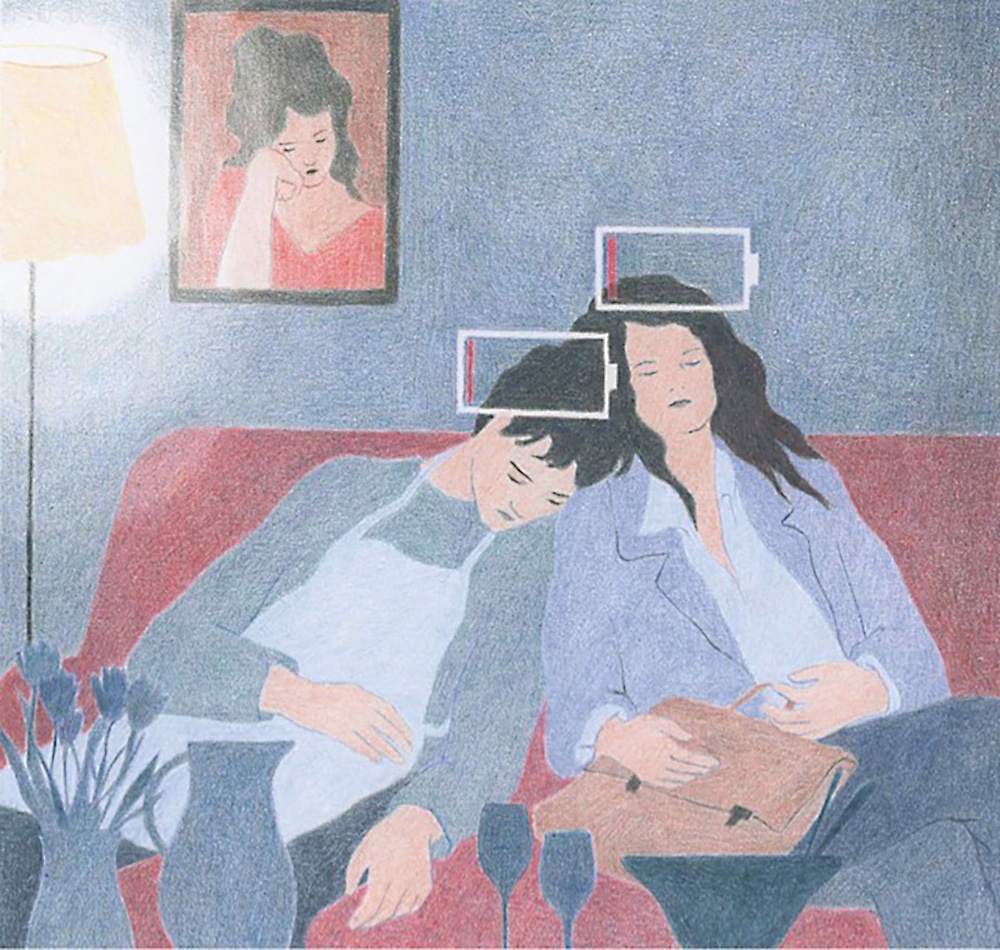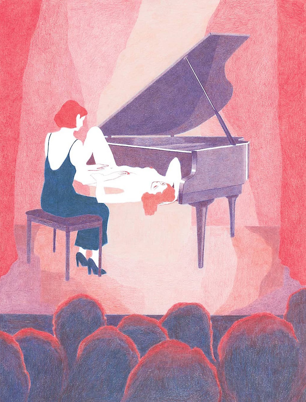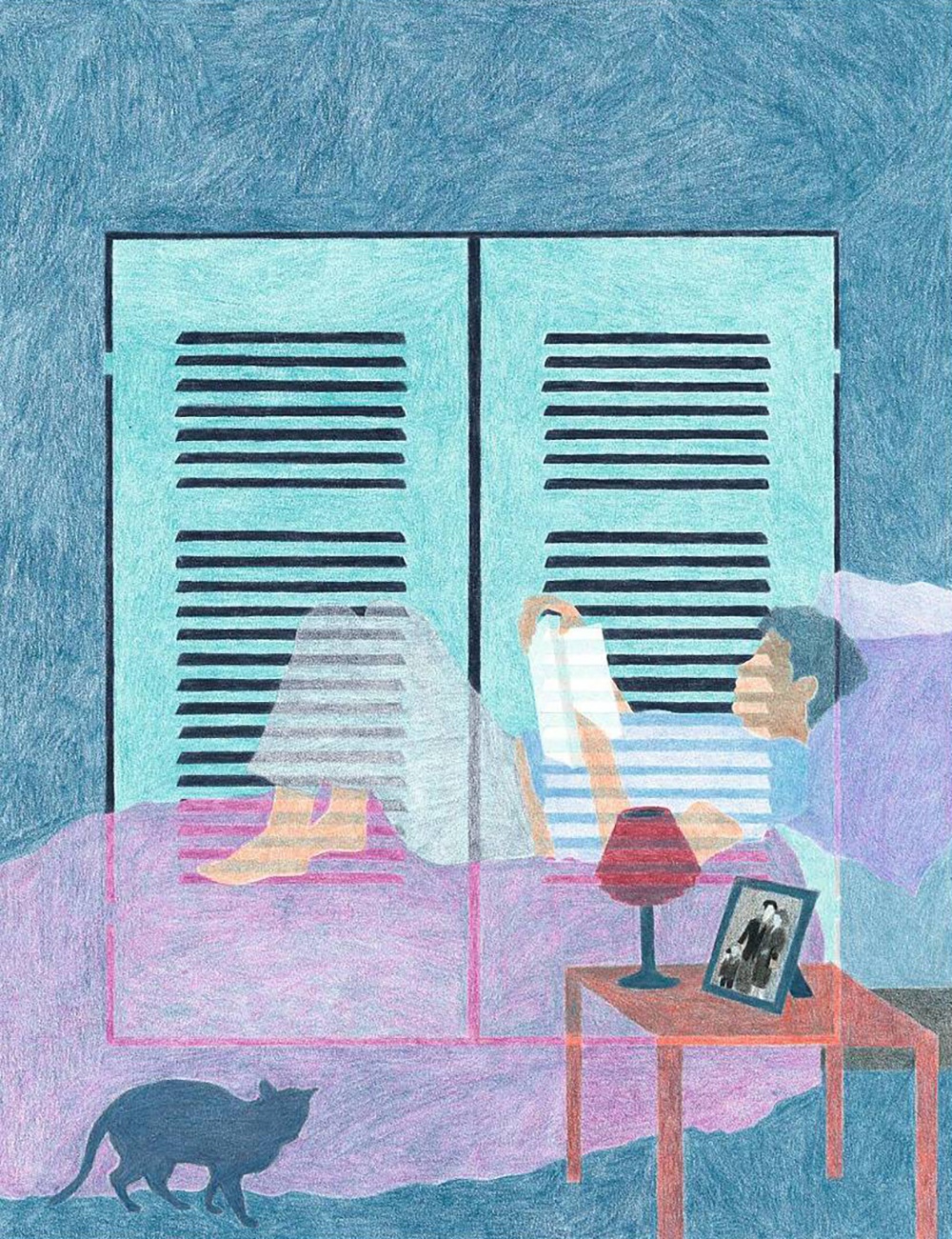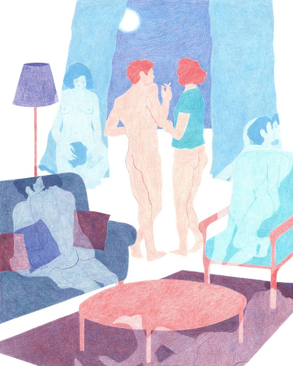 Camille Deschiens disegna esclusivamente con carta e pastelli, nel più tradizionale dei modi. I temi che affronta nei suoi lavori riguardano perlopiù la sfera domestica e sentimentale. Eppure, da questo mix di elementi solo in apparenza banali emerge un immaginario che di banale non ha nulla e, anzi, ci permette di osservare le nostre vite con maggior consapevolezza.