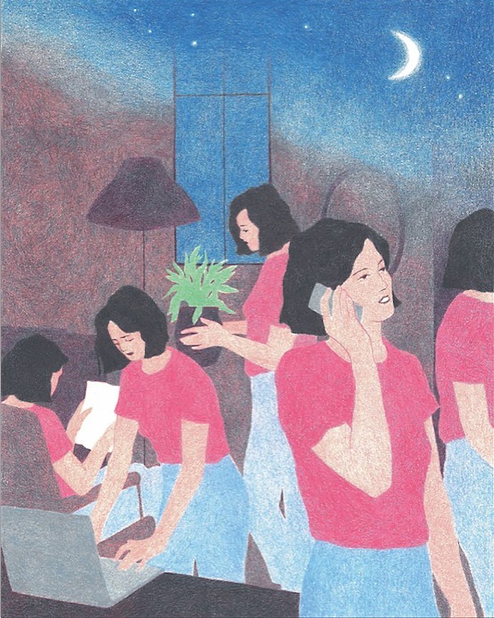 Potremmo paragonarla a una reporter, per la sua capacità di catturare istantanee di vita, azioni e comportamenti che spesso rappresentano la routine e per questo vengono spogliati di ogni attrattiva. Gesti semplici, attimi di intimità, ma anche argomenti più delicati come solitudine e depressione, interpretati con realismo senza badare troppo alla precisione. I contorni delle figure sono assenti e si impastano con il resto della composizione, diventando un tutt’uno. Come a dire: esistiamo solo quando occupiamo il nostro posto nel mondo, siamo il nostro mondo e il nostro mondo è noi.