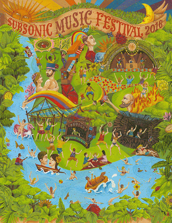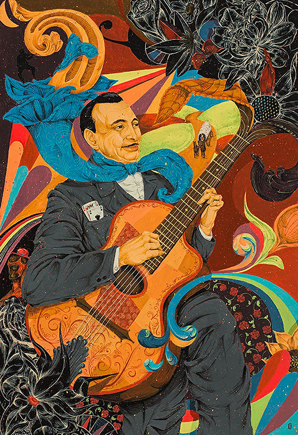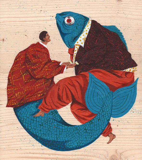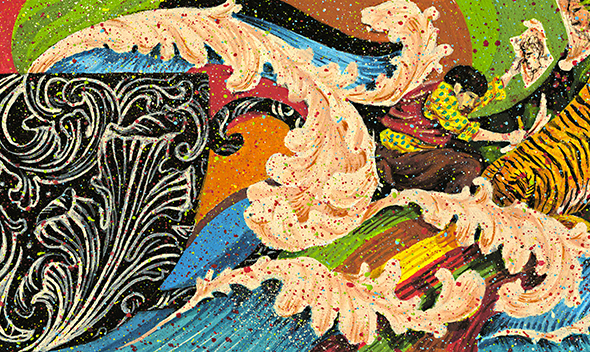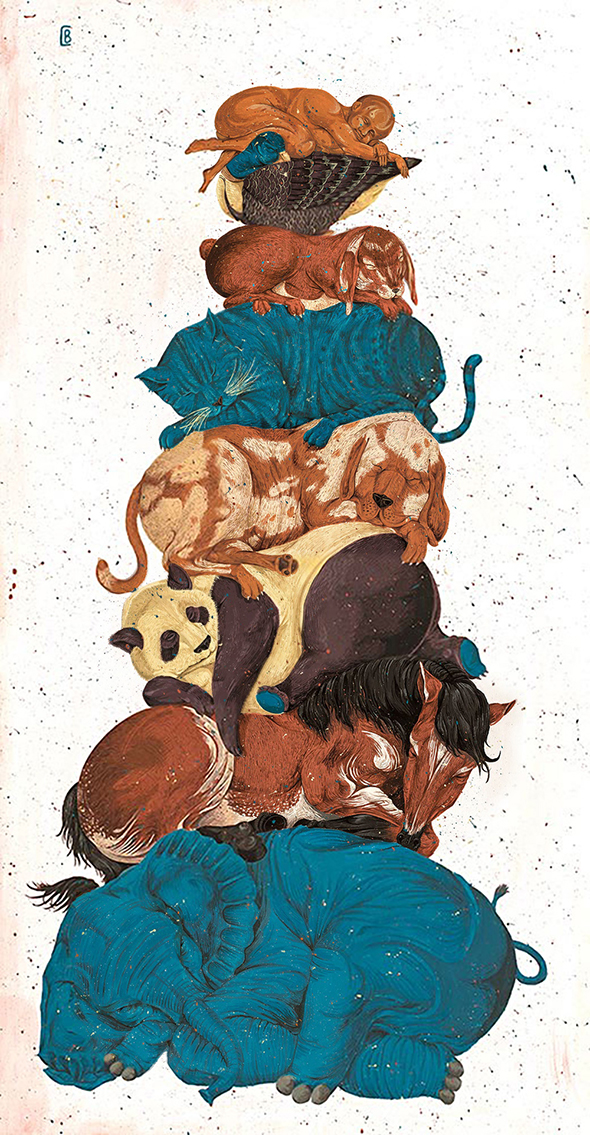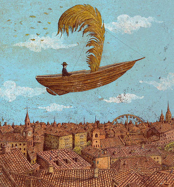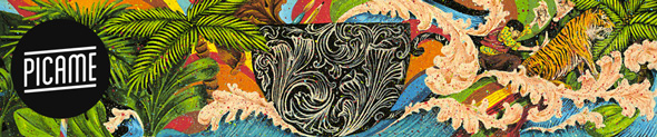 La dimensione del monitor non rende giustizia alle sue creazioni. Per questo motivo sul suo sito personale, a corredo di ogni lavoro, ci sono una serie di ingrandimenti. Questo vale anche per l’header che ha voluto regalare a tutti i lettori di PICAME: un’autoritratto dell’illustratore che viaggia a dorso di tigre, con la febbre di chi non riesce a star dietro alle proprie visioni.
