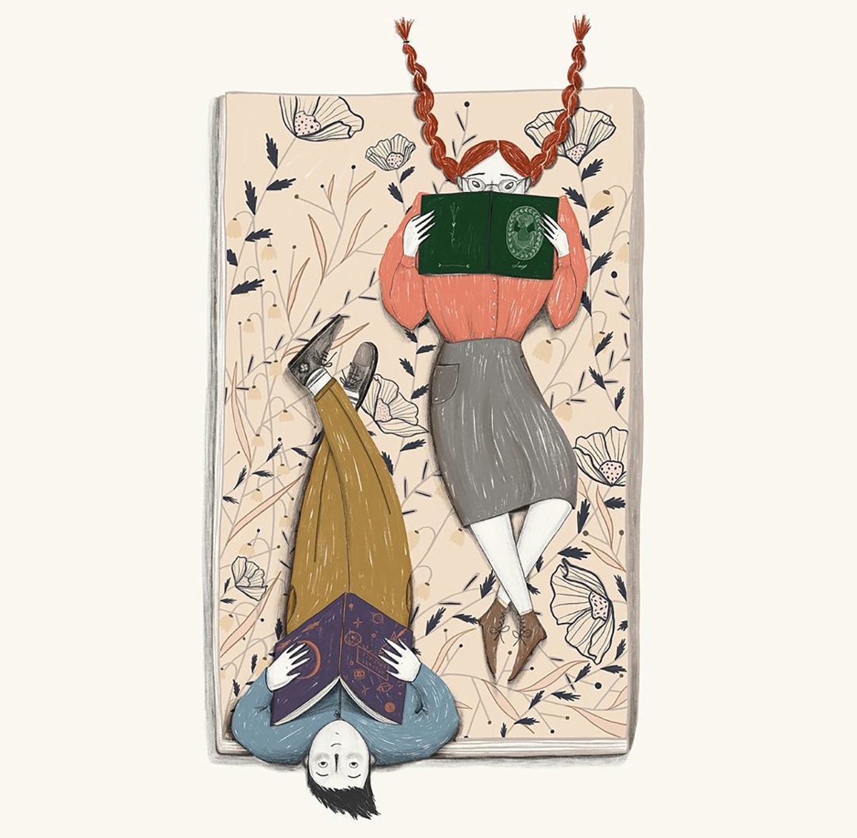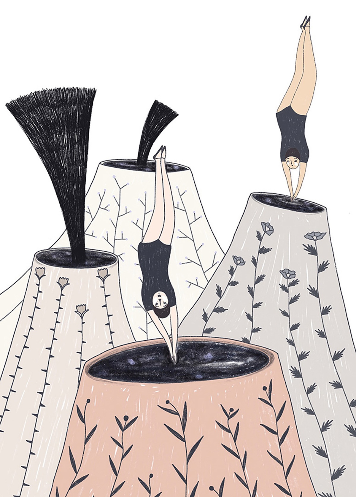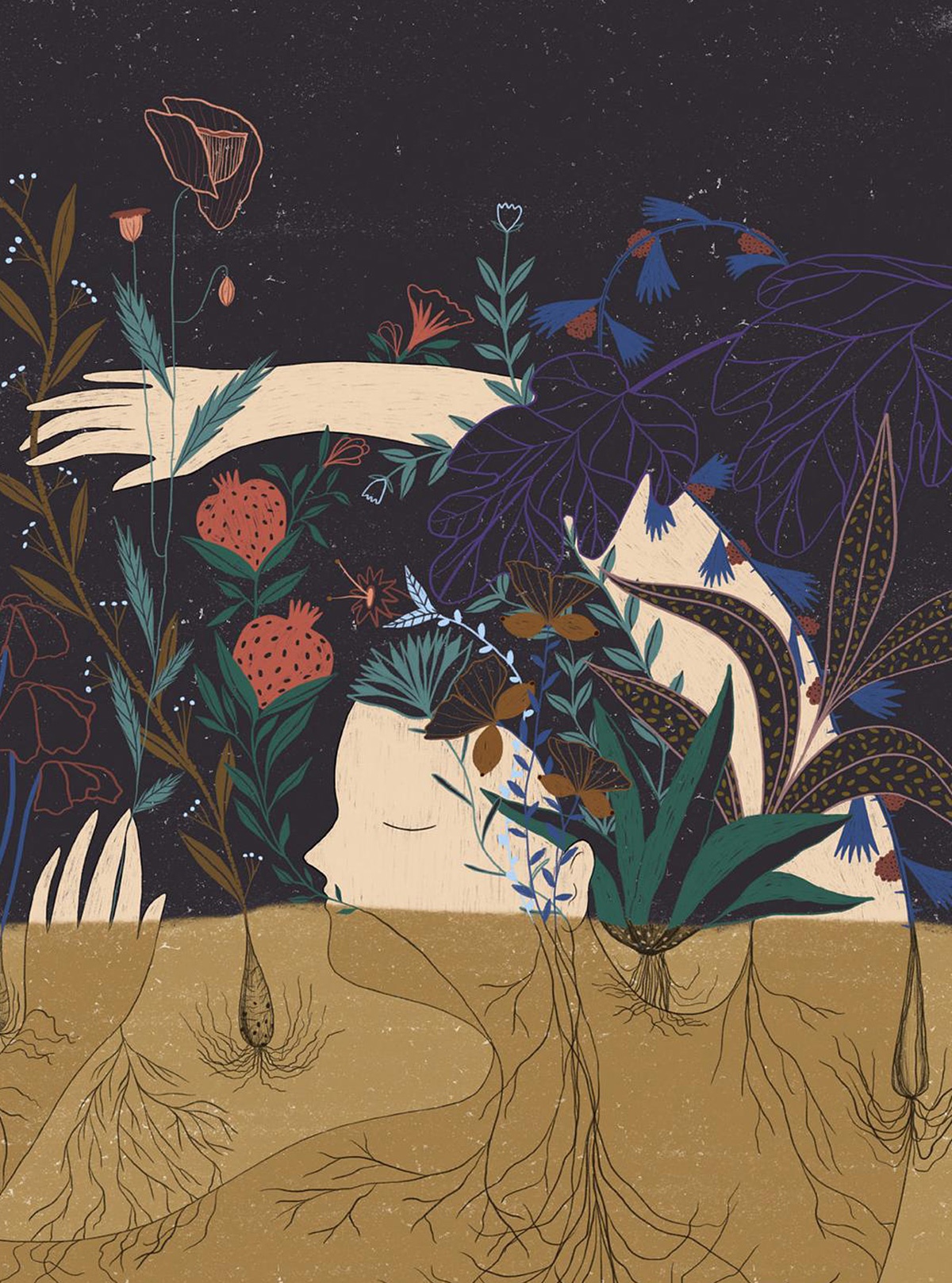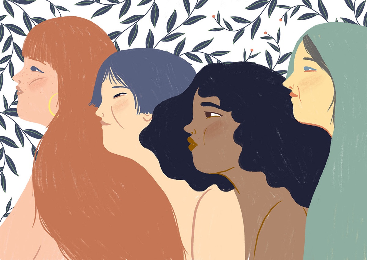 Ne ho diverse. In primis la natura. Sono attratta dall’illustrazione botanica, soprattutto quella delle vecchie enciclopedie e manuali e potrei passare ore in un orto botanico a scattare foto e disegnare. È difficile che riesca ad illustrare qualcosa senza inserirci almeno un rametto o un fiorellino! Creo un dialogo costante tra uomo e natura per indagare su uno stato d’animo o trasmettere un messaggio. Protagonista indiscussa dei miei lavori, insieme alla natura, è la donna. Altre fonti di ispirazione sono le foto della nonna, le memorie di infanzia, il cinema e la letteratura.