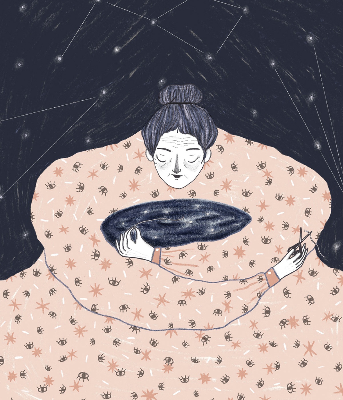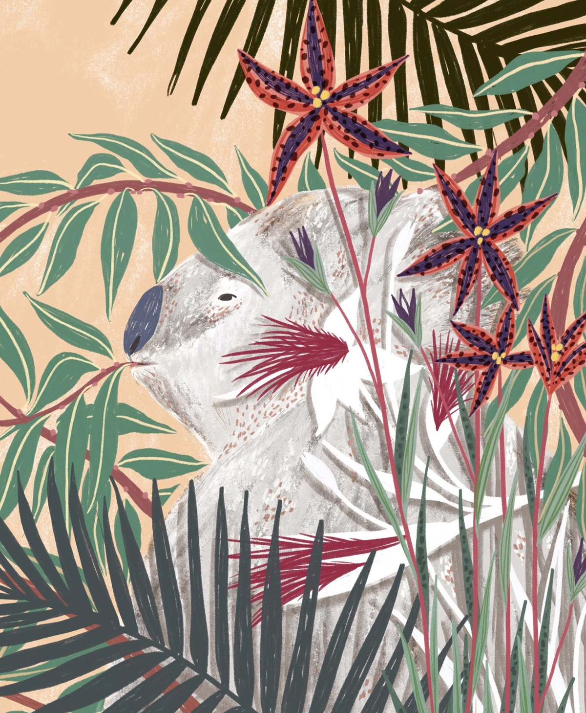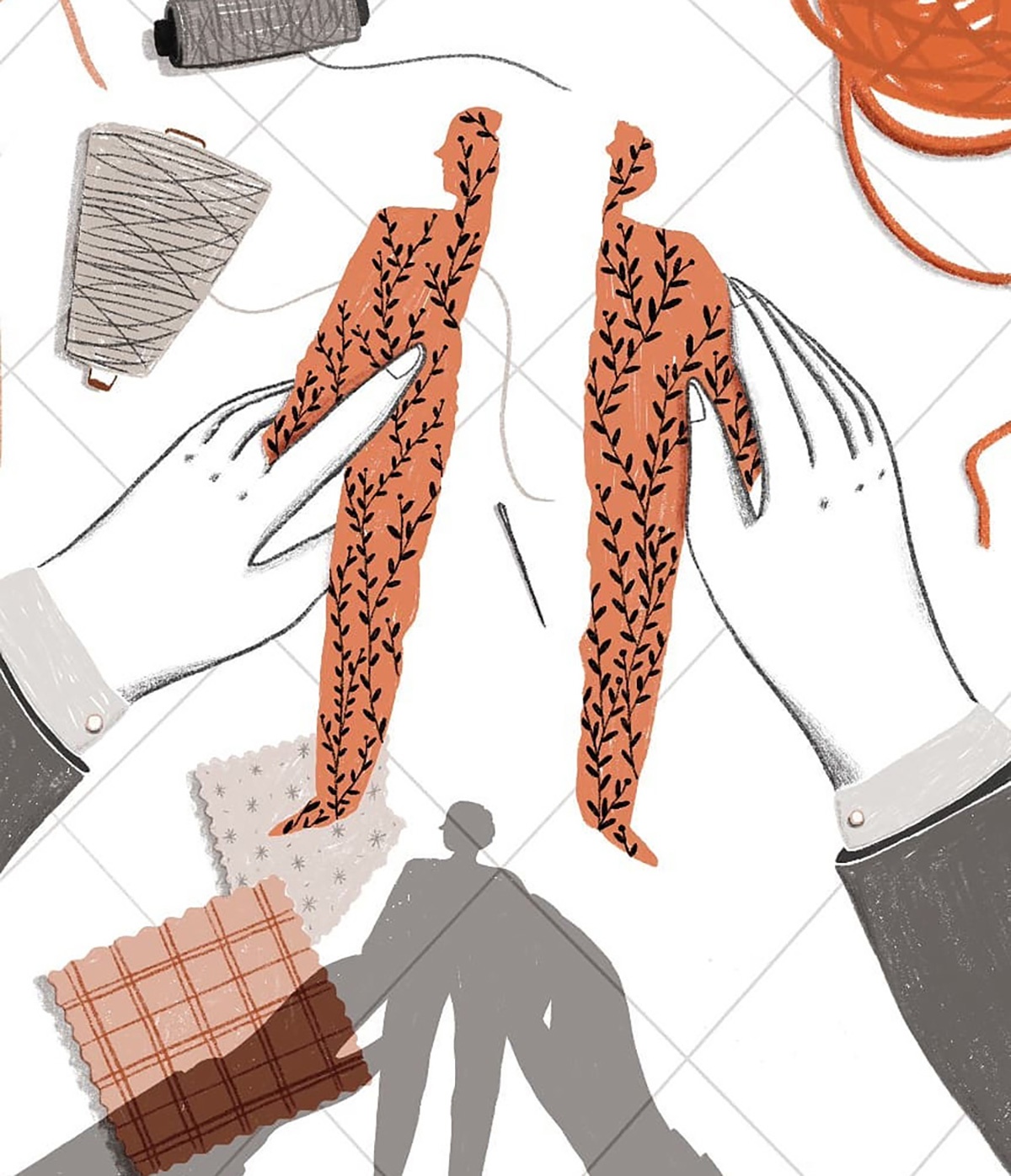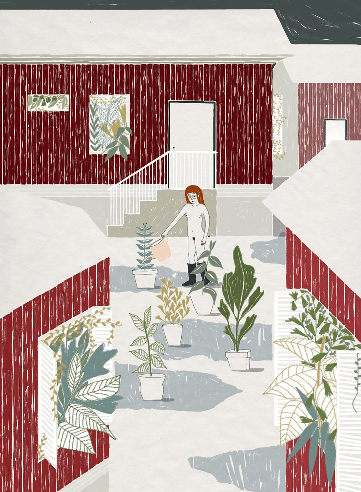 Ne ho diverse. In primis la natura. Sono attratta dall’illustrazione botanica, soprattutto quella delle vecchie enciclopedie e manuali e potrei passare ore in un orto botanico a scattare foto e disegnare. È difficile che riesca ad illustrare qualcosa senza inserirci almeno un rametto o un fiorellino! Creo un dialogo costante tra uomo e natura per indagare su uno stato d’animo o trasmettere un messaggio. Protagonista indiscussa dei miei lavori, insieme alla natura, è la donna. Altre fonti di ispirazione sono le foto della nonna, le memorie di infanzia, il cinema e la letteratura.