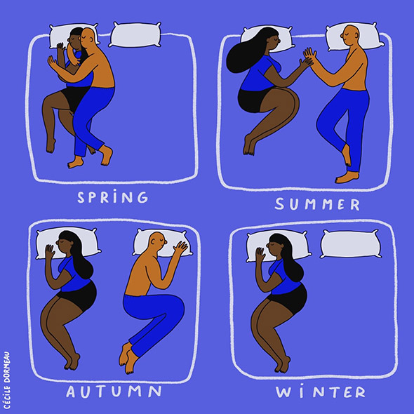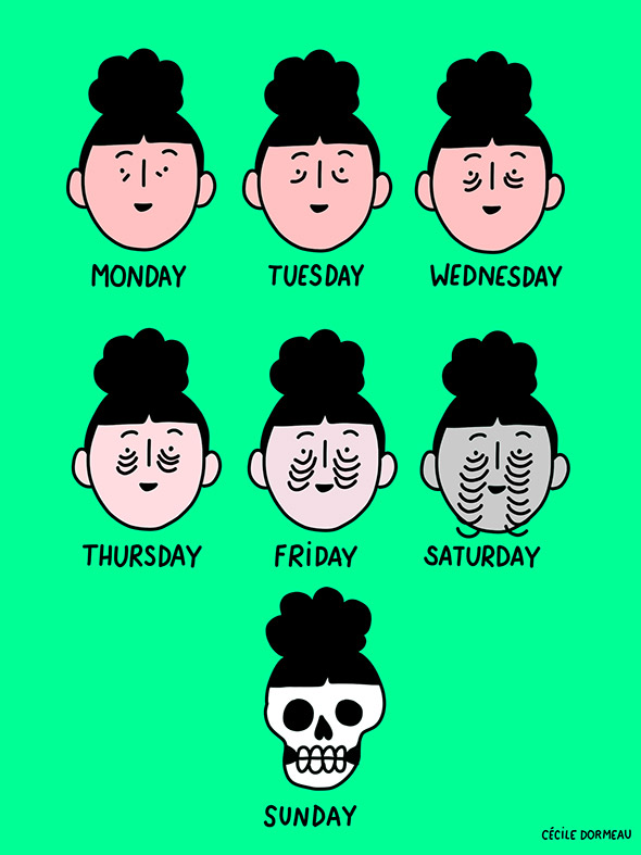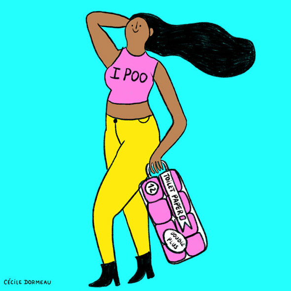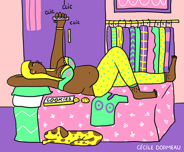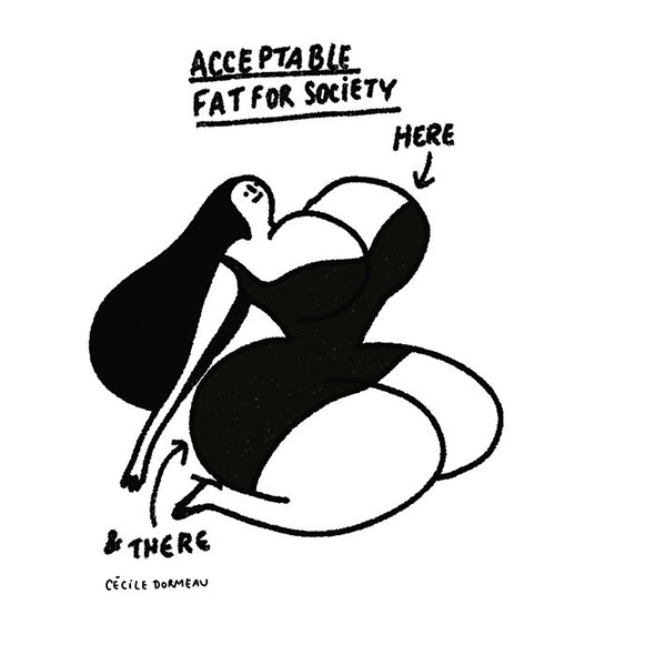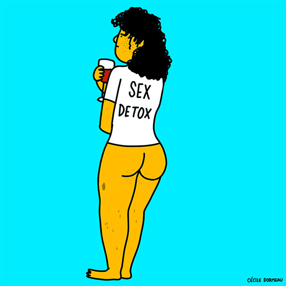 Illustratrice francese con esperienze nella comunicazione di alto livello ed una lunga lista di clienti eccellenti, Cécile Dormeau è una fiera fautrice della body-positivity che non ha paura di sfidare le convenzioni. Immortalate come illustrazioni o animate in divertenti gif, nel suo portfolio sfilano donne di tutte le taglie e colori, alle prese con junk food, chili di troppo, depilazioni, cicli mestruali, love story con o senza lieto fine.