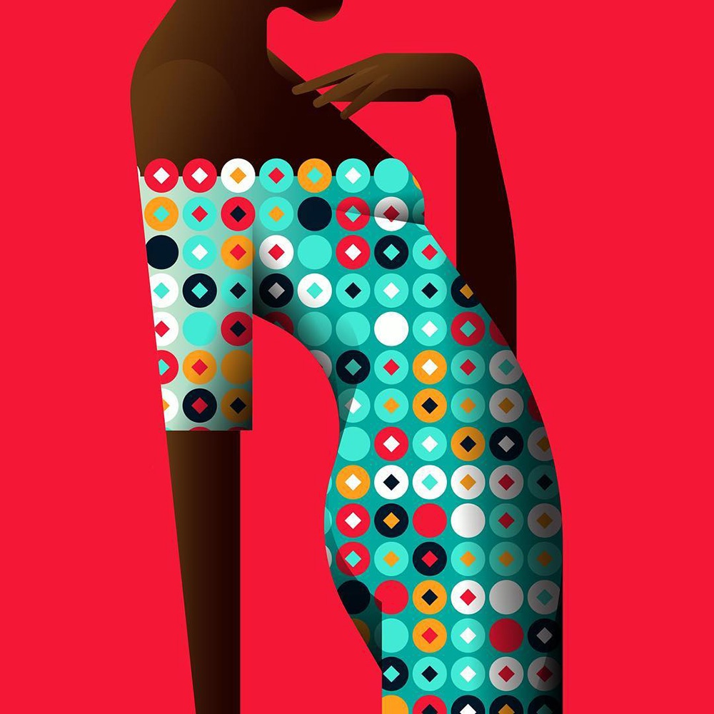 Vettori e forme geometriche, elementi per loro natura rigidi e rigorosi, restituiscono le linee sinuose e i volumi morbidi del corpo femminile, certamente il soggetto preferito dall’illustratore Cesar Santillan.