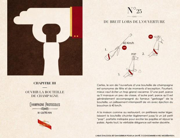 Noma Bar è uno dei più geniali designer del decennio. E fin qui non ho detto nulla di nuovo. Altre volte abbiamo ammirato il suo lavoro da queste pagine, in occasione dell’uscita del libro Negative Spaces o della campagna IBM. Stavolta l’occasione ce la dà lo champagne G.H.Mumm che spiega l’arte e la maniera di accostarsi alle bollicine attraverso 100 protocolli, manco a dirlo, magnificamente illustrati dal Nostro. Ammiriamo ed impariamo.