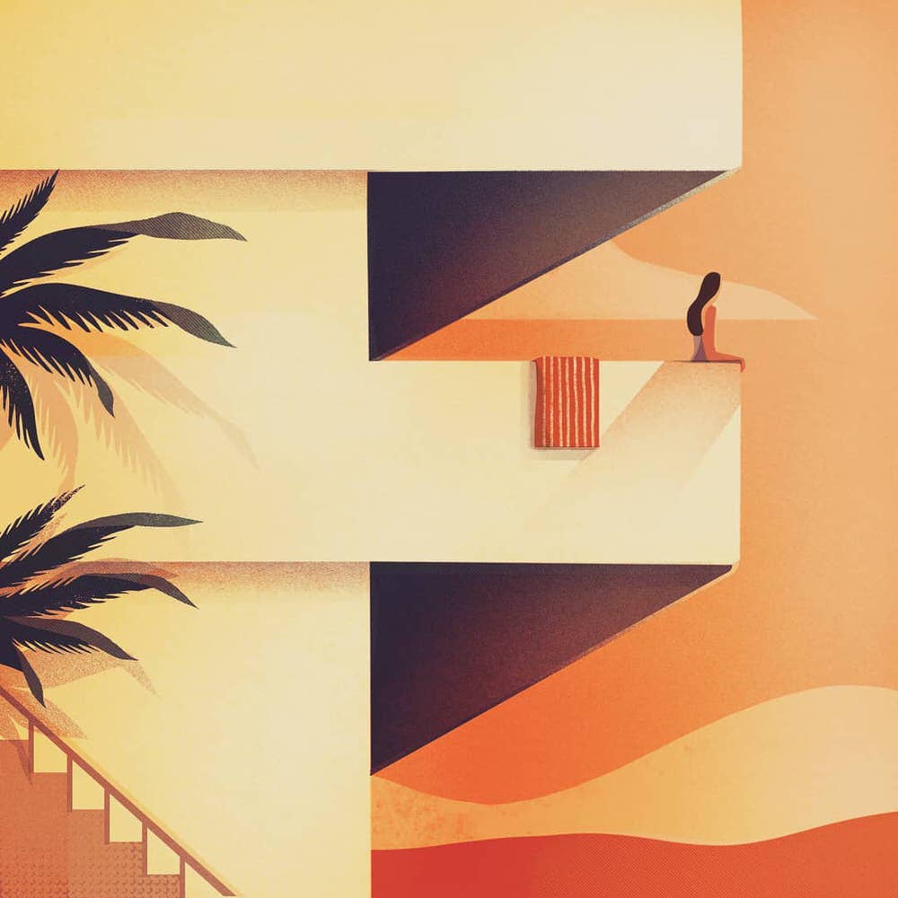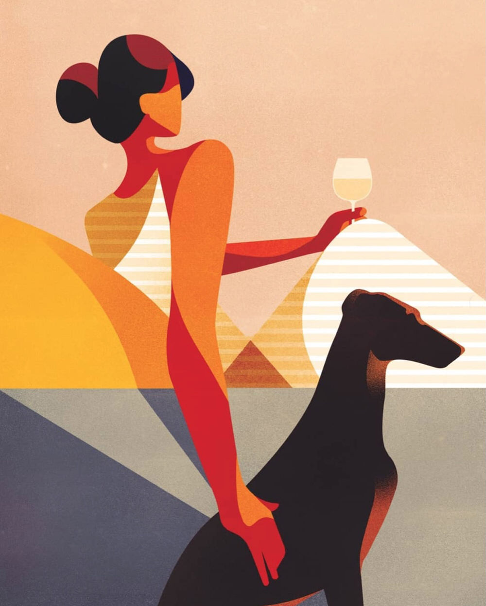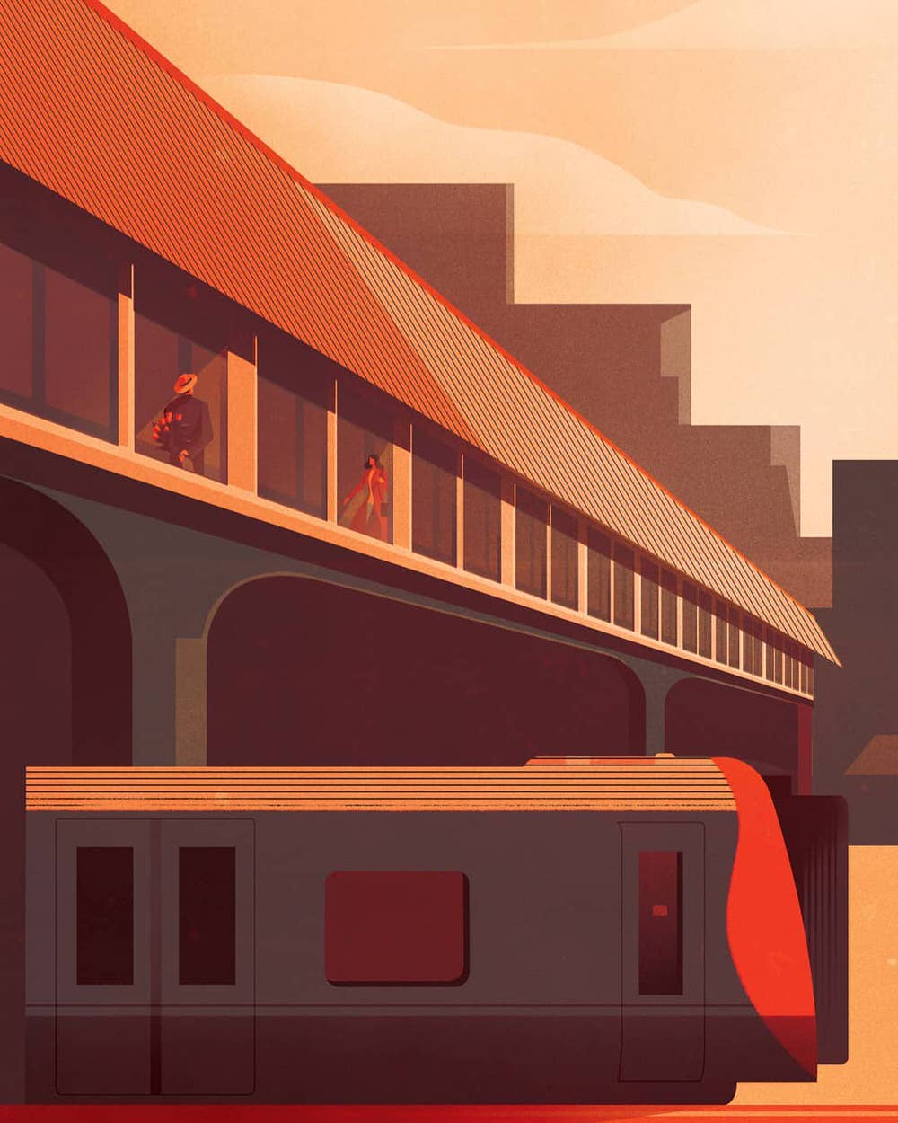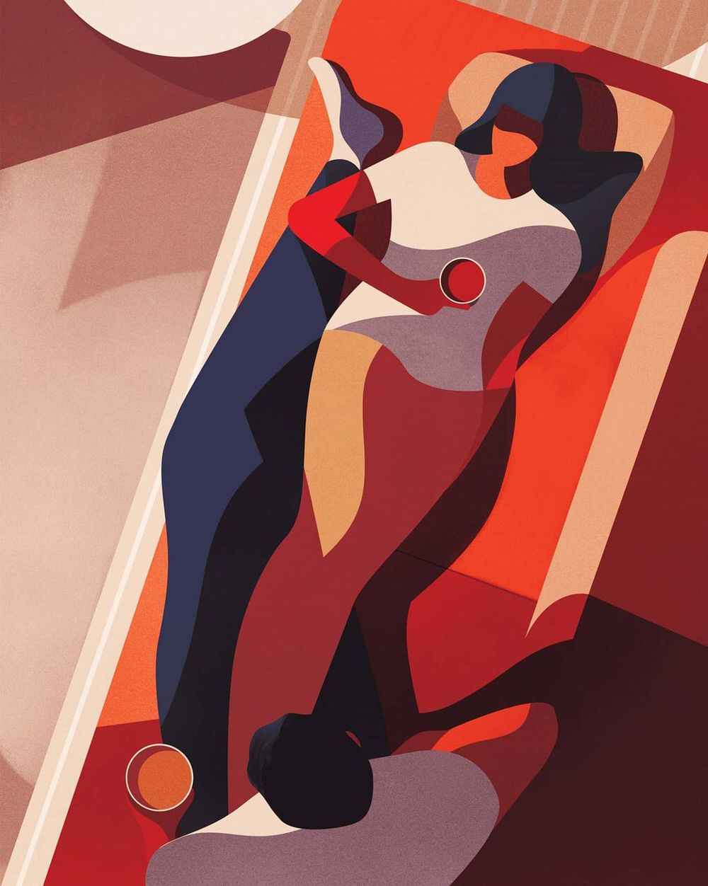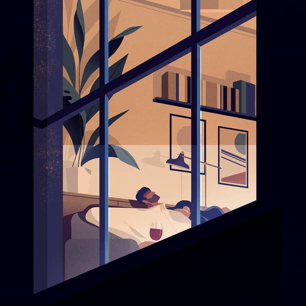 Affascinato dalle forme geometriche e avvolgenti dell'Art Deco degli anni '20 l'illustratore londinese racconta la vita moderna con spirito nostalgico giocando con luci, forme e texture