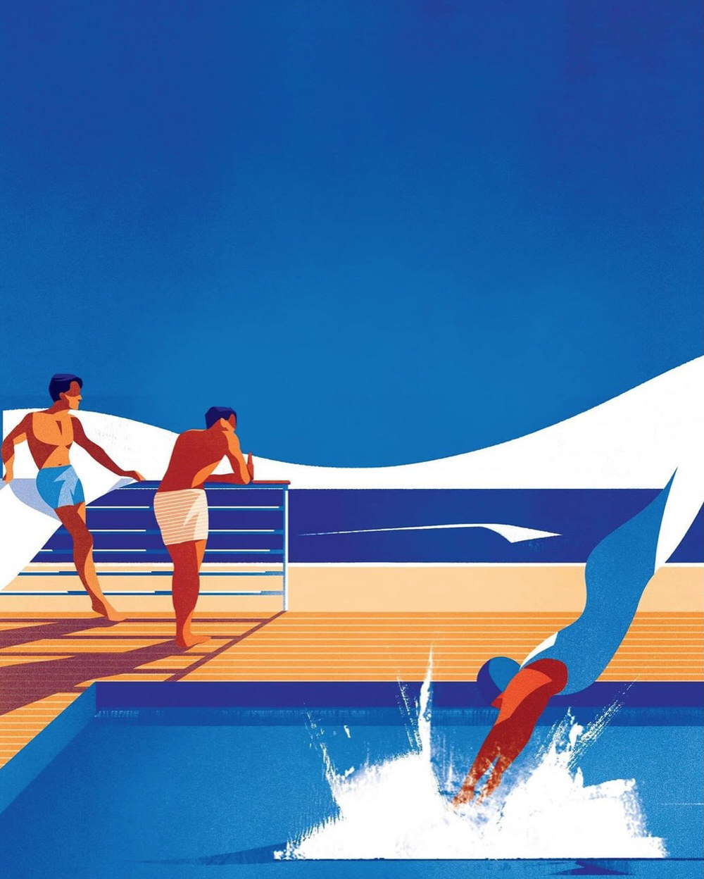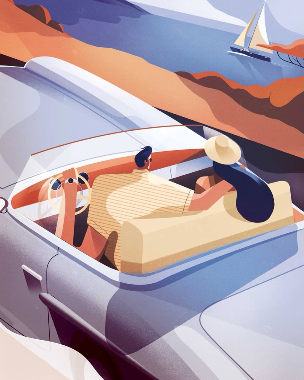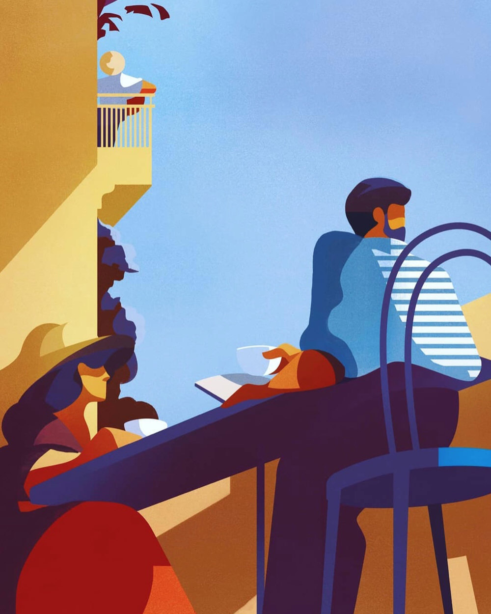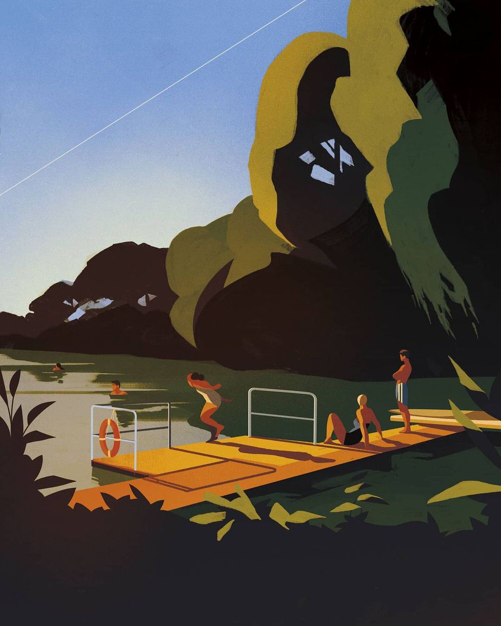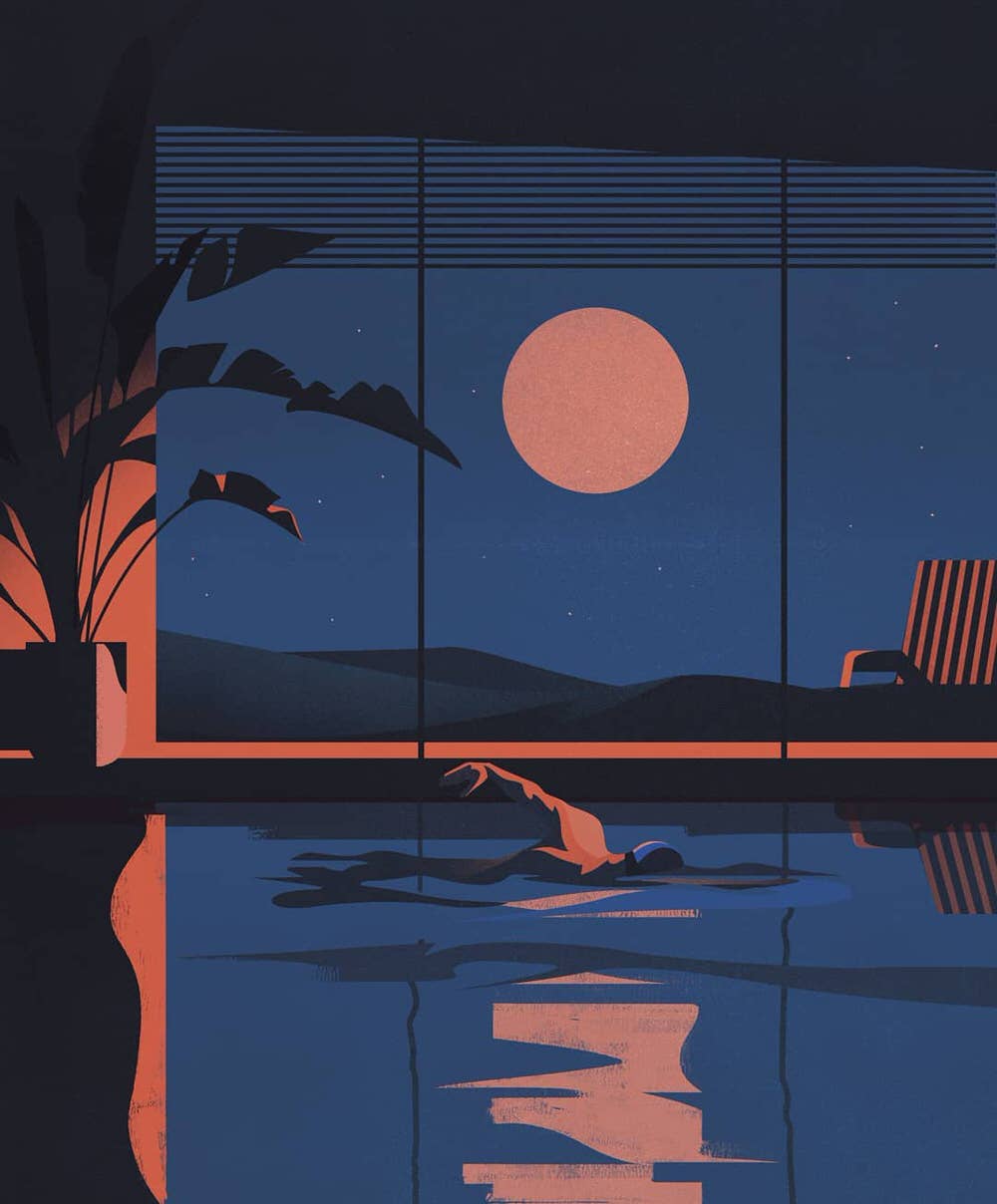 Affascinato dalle forme geometriche e avvolgenti dell'Art Deco degli anni '20 l'illustratore londinese racconta la vita moderna con spirito nostalgico giocando con luci, forme e texture