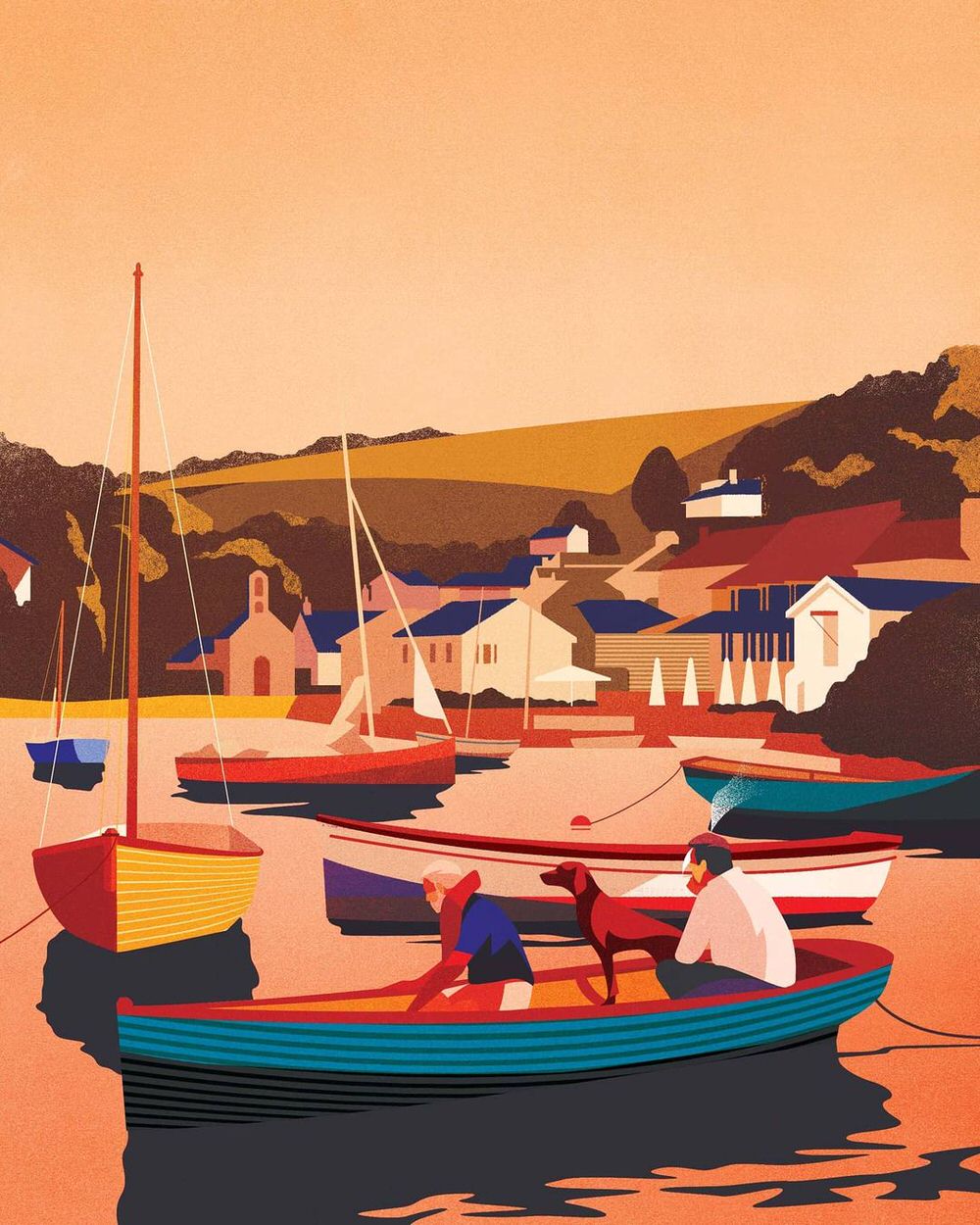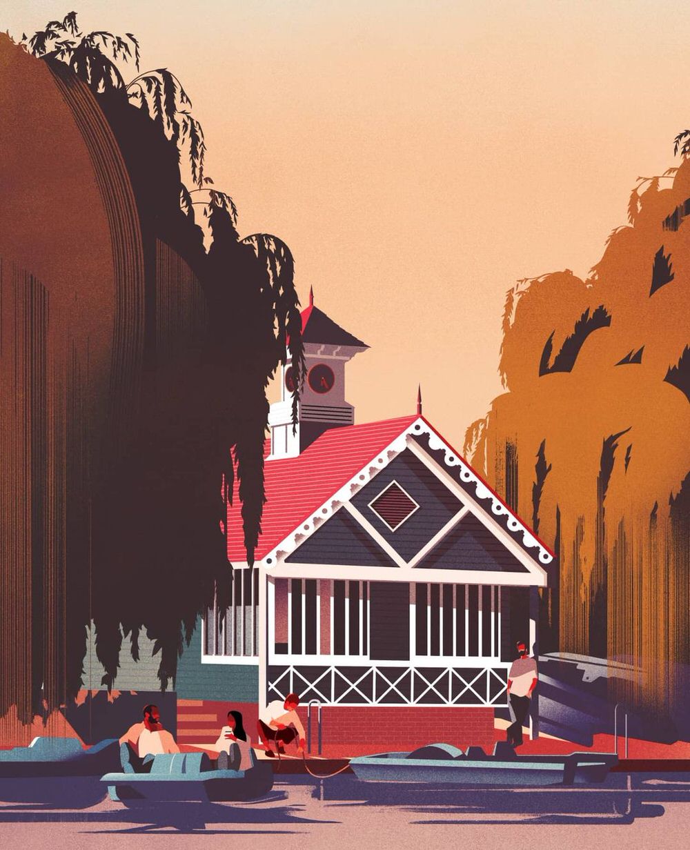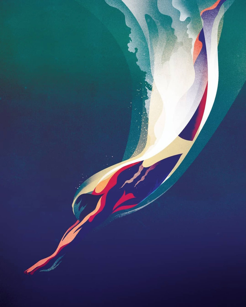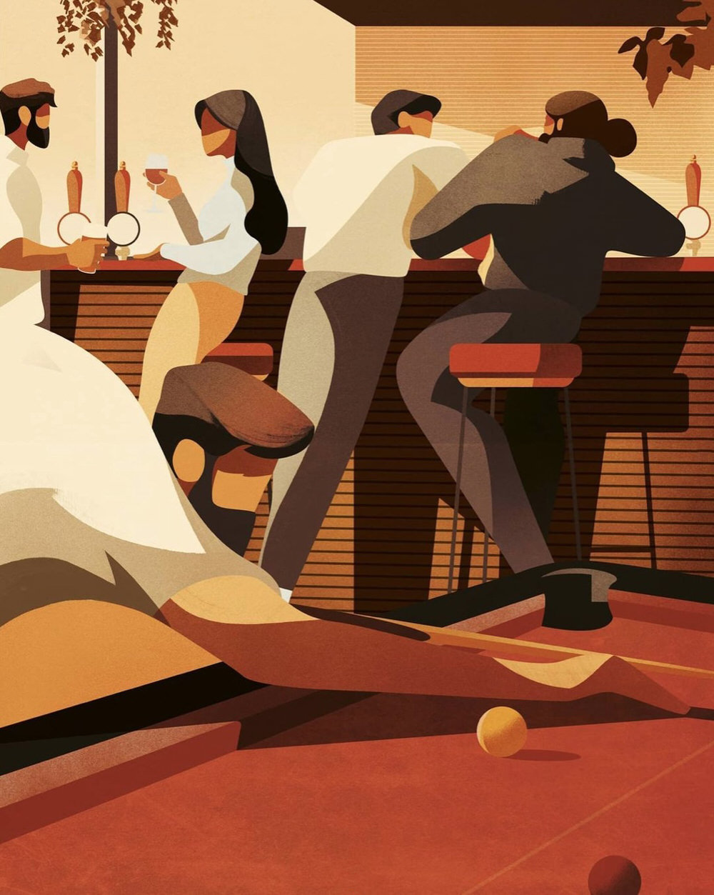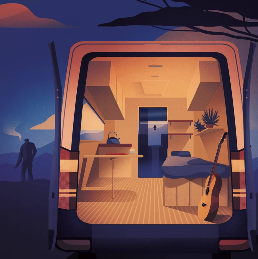 Affascinato dalle forme geometriche e avvolgenti dell'Art Deco degli anni '20 l'illustratore londinese racconta la vita moderna con spirito nostalgico giocando con luci, forme e texture