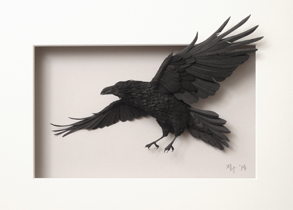 Quello che Cheong-ah Hwang, in arte Papernoodle, riesce a fare con la carta ha più a che fare con la scultura, e la magia, che con il paper-cut. Le immagini sono composte attraverso la sovrapposizione di innumerevoli strati di carta leggera, sapientemente modellata, fino a diventare reali di fronte all’osservatore. Così prendono vita i personaggi della fiabe tradizionali cinesi, Alice davanti al Brucaliffo, e la sorprendente serie di piccoli uccelli bianchi, pronti a spiccare il volo.