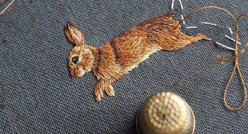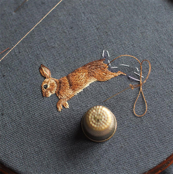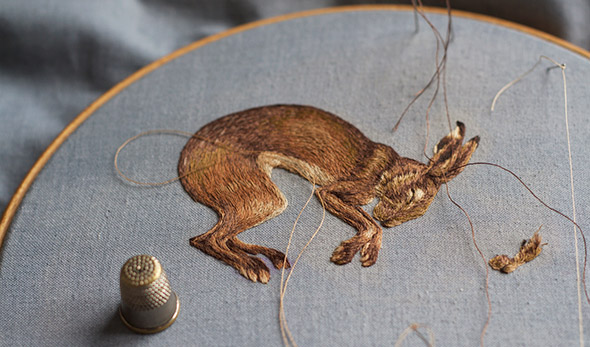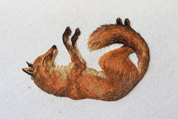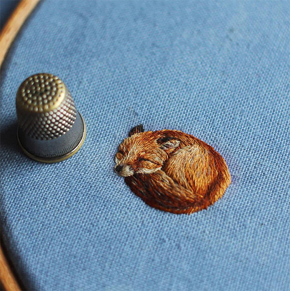 Difficile credere che queste scene bucoliche di animali selvatici dalle mille sfumature di colore, addormentati o semplicemente in attesa tra i fiori siano fatte con ago e filo. Quando l’obiettivo della macchina fotografica si allontana ed inquadra la stoffa, il ditale, la forbice, la magia non si perde ma appare ancora più evidente. Chloe, che pur arriva dal mondo dell’illustrazione tradizionale, si autodefinisce una “ricamatrice” e provvede ad una dettagliata serie di FAQ e consigli sul suo blog per chi, ammirandone il lavoro, aspira ad emularne le gesta. E fa sorridere la semplicità con cui gli utenti la interrogano su come riuscire a gestire tutti quei fili diversi senza diventare pazzi. Il talento talvolta è davvero difficile da spiegare.