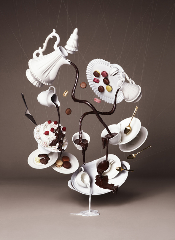NAM è il nome di un collettivo di creativi con sede a Tokyo. Fondato nel 2006 dal graphic designer Takayuki Nakazawa e dal fotografo Hiroshi Manaka, attualmente è composto da più di 10 artisti. Una delle tecniche più utilizzate nel lavoro di NAM consiste in creare scenari in cui gli oggetti sembrano essere sospesi nel vuoto in assenza di peso. Uno dei loro ultimi lavori è questa serie di fotografie per la campagna pubblicitaria dell’Harbour City Chocolate Trail.