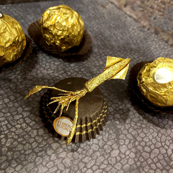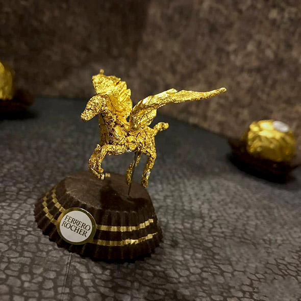 L’incarto dorato della celebre pralina crea interessanti effetti luminosi e – trovata geniale – il basamento marrone, una volta capovolto, diventa il piedistallo che sorregge la mini scultura. Persino il bollino viene riutilizzato per impreziosire l’opera finita. Chissà se il signor Ferrero avrebbe mai immaginato un riutilizzo tanto creativo del suo iconico packaging!